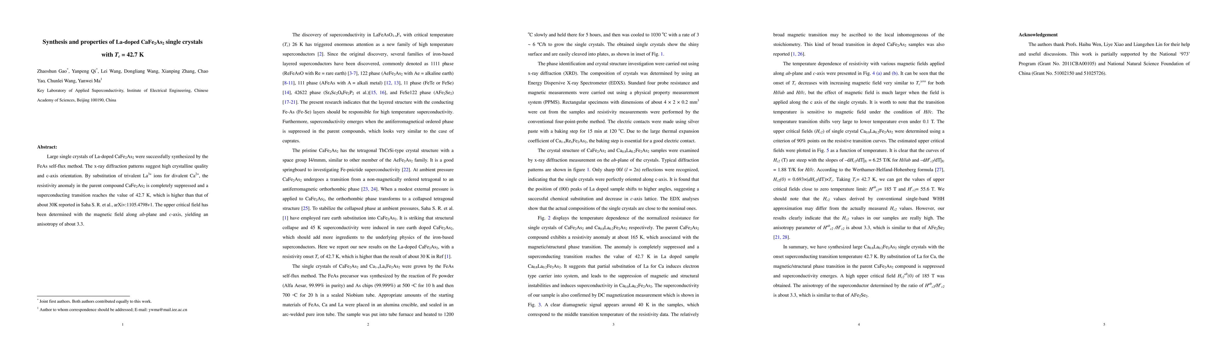 La-doped CaFe2As2 single crystals were synthesized using the FeAs self-flux method, achieving a superconducting transition temperature of 42.7 K, higher than previously reported values. The substitution of La3+ for Ca2+ suppresses resistivity anomalies and enhances superconductivity, with an anisotropy of approximately 3.3 in the upper critical field.