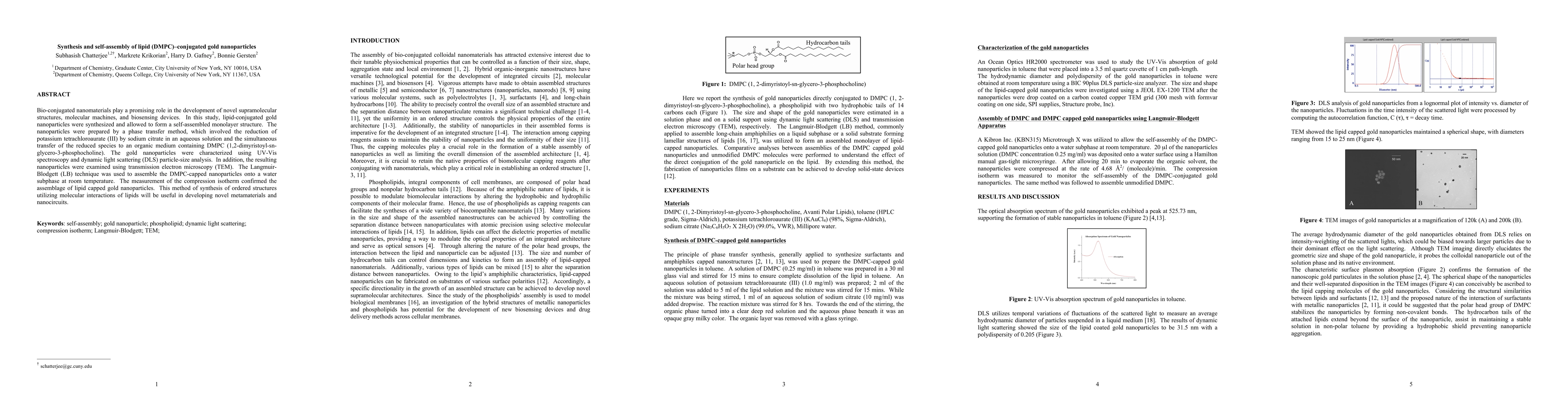 Bio-conjugated nanomaterials play a promising role in the development of novel supramolecular structures, molecular machines, and biosensing devices. In this study, lipid-conjugated gold nanoparticles were synthesized and allowed to form a self-assembled monolayer structure. The nanoparticles were prepared by a phase transfer method, which involved the reduction of potassium tetrachloroaurate (III) by sodium citrate in an aqueous solution and the simultaneous transfer of the reduced species to an organic medium containing DMPC (1,2-dimyristoyl-sn-glycero-3-phosphocholine). The gold nanoparticles were characterized using UV-Vis spectroscopy and dynamic light scattering (DLS) particle-size analysis. In addition, the resulting nanoparticles were examined using transmission electron microscopy (TEM). The Langmuir-Blodgett (LB) technique was used to assemble the DMPC-capped nanoparticles onto a water subphase at room temperature. The measurement of the compression isotherm confirmed the assemblage of lipid capped gold nanoparticles. This method of synthesis of ordered structures utilizing molecular interactions of lipids will be useful in developing novel metamaterials and nanocircuits.