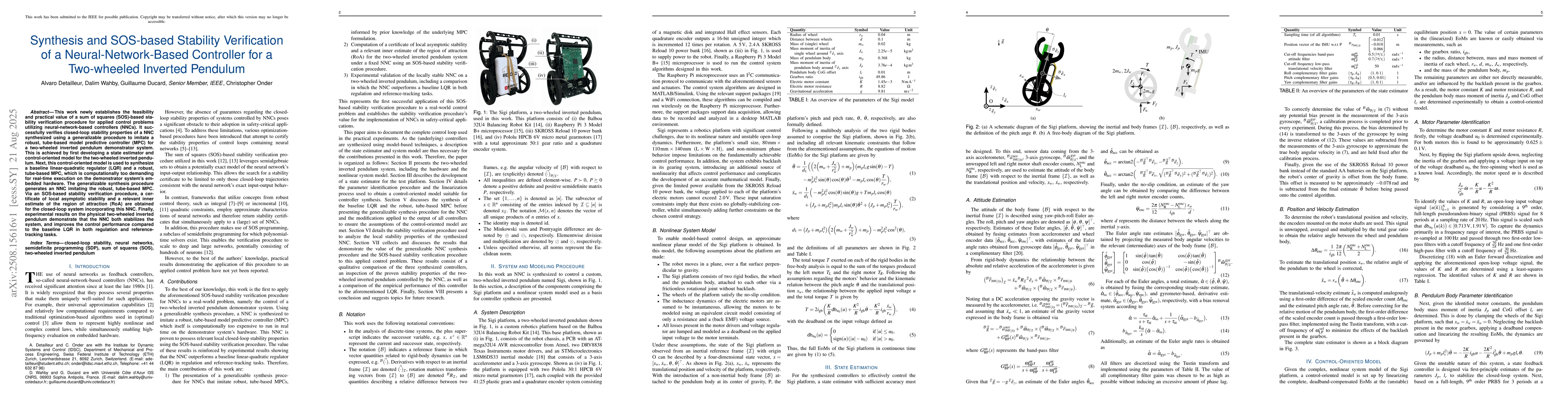 This work newly establishes the feasibility and practical value of a sum of squares (SOS)-based stability verification procedure for applied control problems utilizing neural-network-based controllers (NNCs). It successfully verifies closed-loop stability properties of a NNC synthesized using a generalizable procedure to imitate a robust, tube-based model predictive controller (MPC) for a two-wheeled inverted pendulum demonstrator system. This is achieved by first developing a state estimator and control-oriented model for the two-wheeled inverted pendulum. Next, this control-oriented model is used to synthesize a baseline linear-quadratic regulator (LQR) and a robust, tube-based MPC, which is computationally too demanding for real-time execution on the demonstrator system's embedded hardware. The generalizable synthesis procedure generates an NNC imitating the robust, tube-based MPC. Via an SOS-based stability verification procedure, a certificate of local asymptotic stability and a relevant inner estimate of the region of attraction (RoA) are obtained for the closed-loop system incorporating this NNC. Finally, experimental results on the physical two-wheeled inverted pendulum demonstrate that the NNC both stabilizes the system, and improves the control performance compared to the baseline LQR in both regulation and reference-tracking tasks.