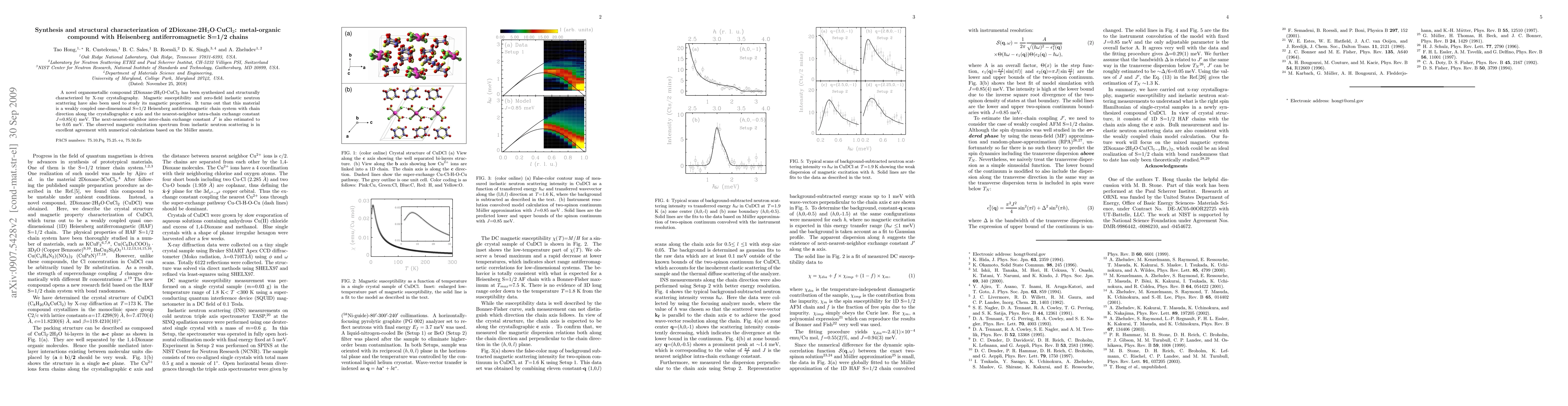 A novel organometallic compound 2Dioxane.CuCl2.2H2O has been synthesized and structurally characterized by X-ray crystallography. Magnetic susceptibility and zero-field inelastic neutron scattering have also been used to study its magnetic properties. It turns out that this material is a weakly coupled one-dimensional S=1/2 Heisenberg antiferromagnetic chain system with chain direction along the crystallographic c axis and the nearest-neighbor intra-chain exchange constant J=0.85(4) meV. The next-nearest-neighbor inter-chain exchange constant J' is also estimated to be 0.05 meV. The observed magnetic excitation spectrum from inelastic neutron scattering is in excellent agreement with numerical calculations based on the Muller ansatz.