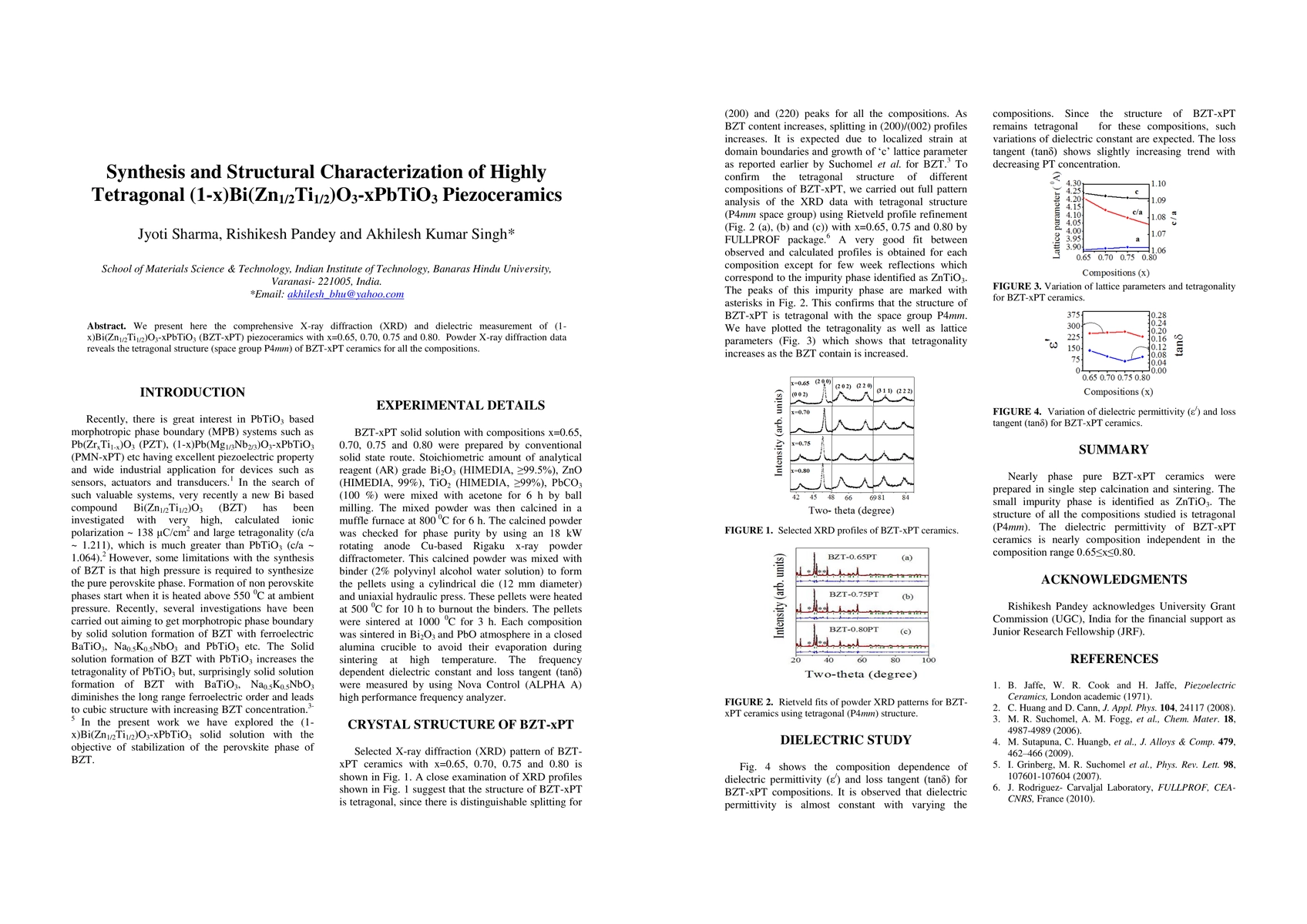 This study investigates the synthesis and structural characterization of (1-x)Bi(Zn1/2Ti1/2)O3-xPbTiO3 piezoceramics using X-ray diffraction and dielectric measurements. The results show a highly tetragonal structure (space group P4mm) for all compositions (x=0.65, 0.70, 0.75, and 0.80).