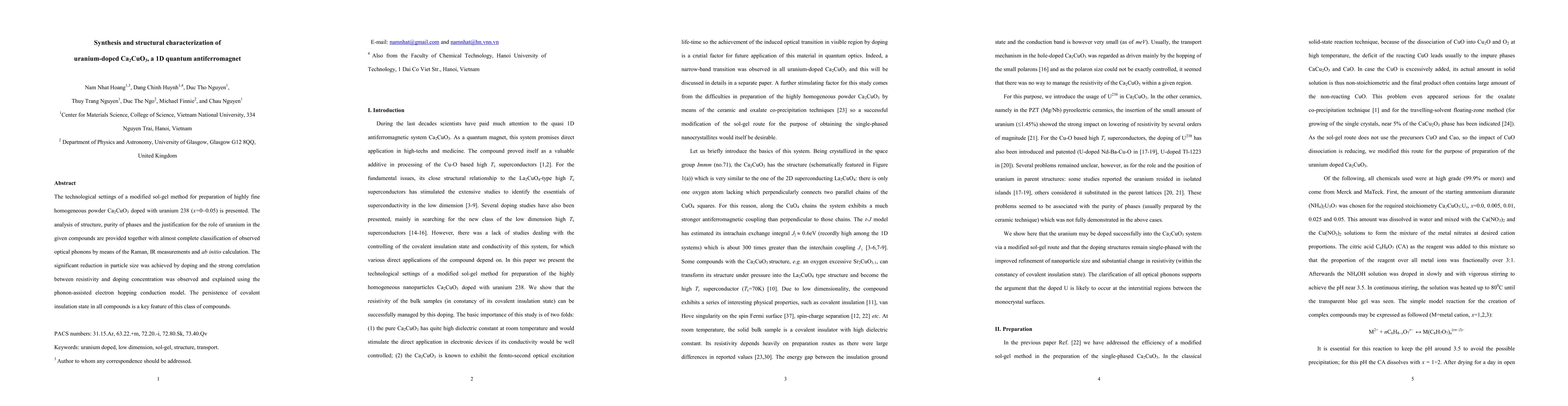 The technological settings of a modified sol-gel method for preparation of highly fine homogeneous powder Ca2CuO3 doped with uranium 238 (x=0-0.05) is presented. The analysis of structure, purity of phases and the justification for the role of uranium in the given compounds are provided together with almost complete classification of observed optical phonons by means of the Raman, IR measurements and ab initio calculation. The significant reduction in particle size was achieved by doping and the strong correlation between resistivity and doping concentration was observed and explained using the phonon-assisted electron hopping conduction model. The persistence of covalent insulation state in all compounds is a key feature of this class of compounds.