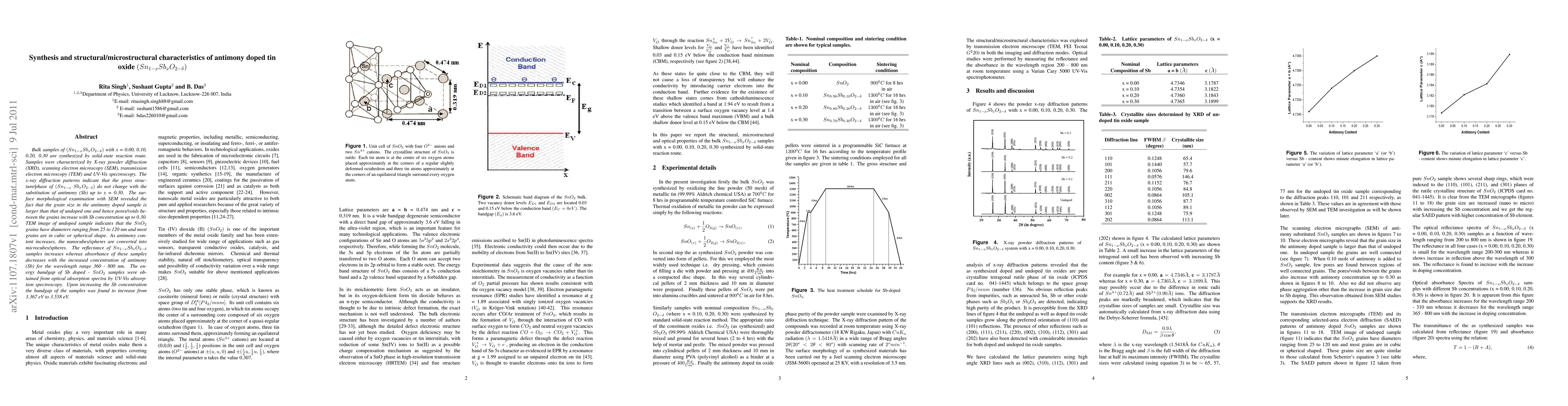 Bulk samples of $(Sn_{1-x}Sb_{x}O_{2-\delta})$ with x = 0.00, 0.10, 0.20, 0.30 are synthesized by solid-state reaction route. Samples were characterized by X-ray powder diffraction (XRD), scanning electron microscopy (SEM), transmission electron microscopy (TEM) and UV-Vis spectroscopy. The x-ray diffraction patterns indicate that the gross structure/phase of $(Sn_{1-x}$ $Sb_{x}O_{2-\delta})$ do not change with the substitution of antimony (Sb) up to x = 0.30. The surface morphological examination with SEM revealed the fact that the grain size in the antimony doped sample is larger than that of undoped one and hence pores/voids between the grains increase with Sb concentration up to 0.30. TEM image of undoped sample indicates that the $SnO_{2}$ grains have diameters ranging from 25 to 120 nm and most grains are in cubic or spherical shape. As antimony content increases, the nanocubes/spheres are converted into microcubes/spheres. The reflectance of $Sn_{1-x}Sb_{x}O_{2-\delta}$ samples increases whereas absorbance of these samples decreases with the increased concentration of antimony (Sb) for the wavelength range 360 - 800 nm. The energy bandgap of Sb doped - $SnO_{2}$ samples were obtained from optical absorption spectra by UV-Vis absorption spectroscopy. Upon increasing the Sb concentration the bandgap of the samples was found to increase from 3.367 eV to 3.558 eV.