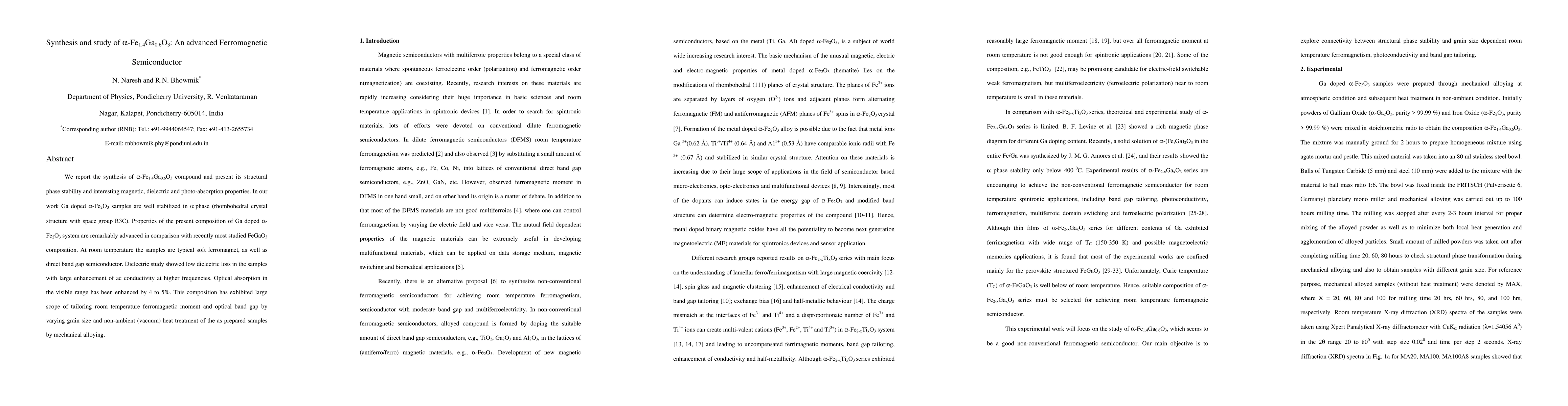 We report the synthesis of alpha-Fe1.4Ga0.6O3 compound and present its structural phase stability and interesting magnetic, dielectric and photo-absorption properties. In our work Ga doped alpha-Fe2O3 samples are well stabilized in alpha phase (rhombohedral crystal structure with space group R3C). Properties of the present composition of Ga doped alpha-Fe2O3 system are remarkably advanced in comparison with recently most studied FeGaO3 composition. At room temperature the samples are typical soft ferromagnet, as well as direct band gap semiconductor. Dielectric study showed low dielectric loss in the samples with large enhancement of ac conductivity at higher frequencies. Optical absorption in the visible range has been enhanced by 4 to 5%. This composition has exhibited large scope of tailoring room temperature ferromagnetic moment and optical band gap by varying grain size and non-ambient (vacuum) heat treatment of the as prepared samples by mechanical alloying.