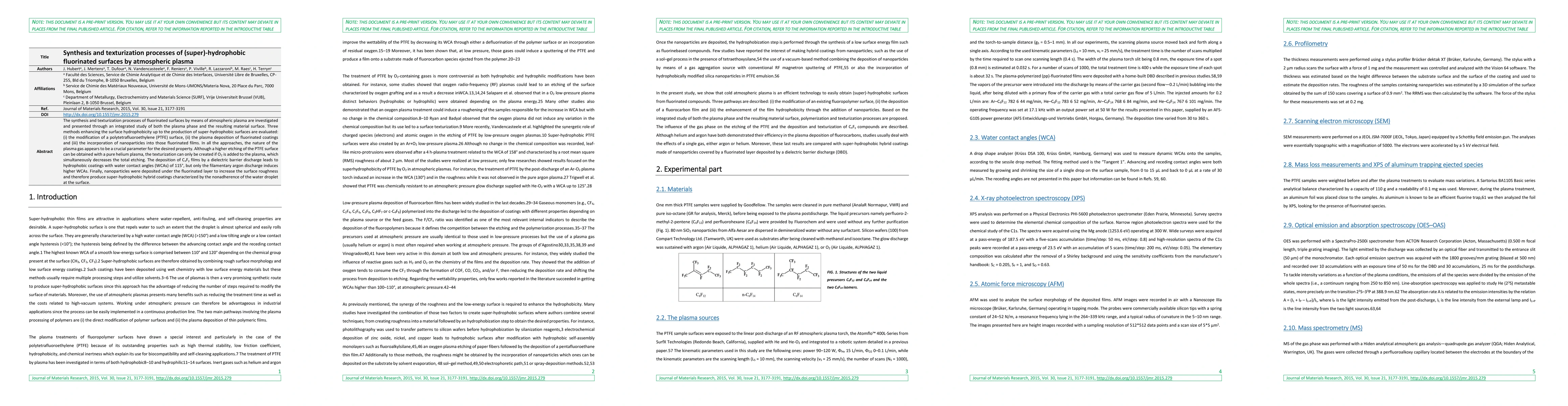 Researchers investigated methods to create super-hydrophobic fluorinated surfaces using atmospheric plasma, finding that adding oxygen to the plasma and incorporating nanoparticles can produce water-repellent coatings.