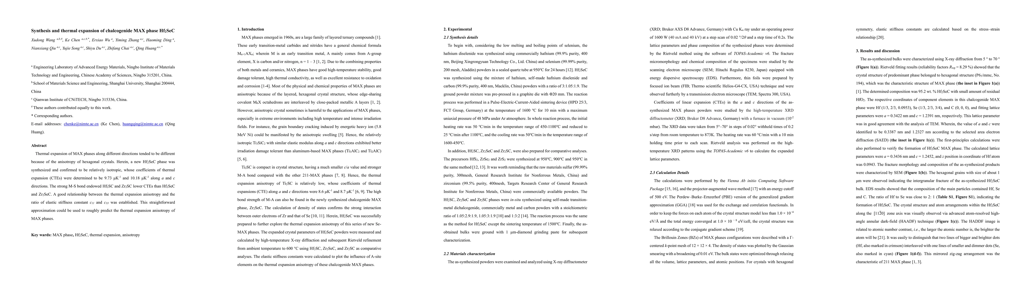 A new Hf2SeC MAX phase, relatively isotropic in thermal expansion, was synthesized with CTEs of 9.73 μK-1 and 10.18 μK-1 along a and c directions. The study established a relationship between thermal expansion anisotropy and the ratio of elastic stiffness constants c11 and c33, providing a method for predicting anisotropy in MAX phases.
