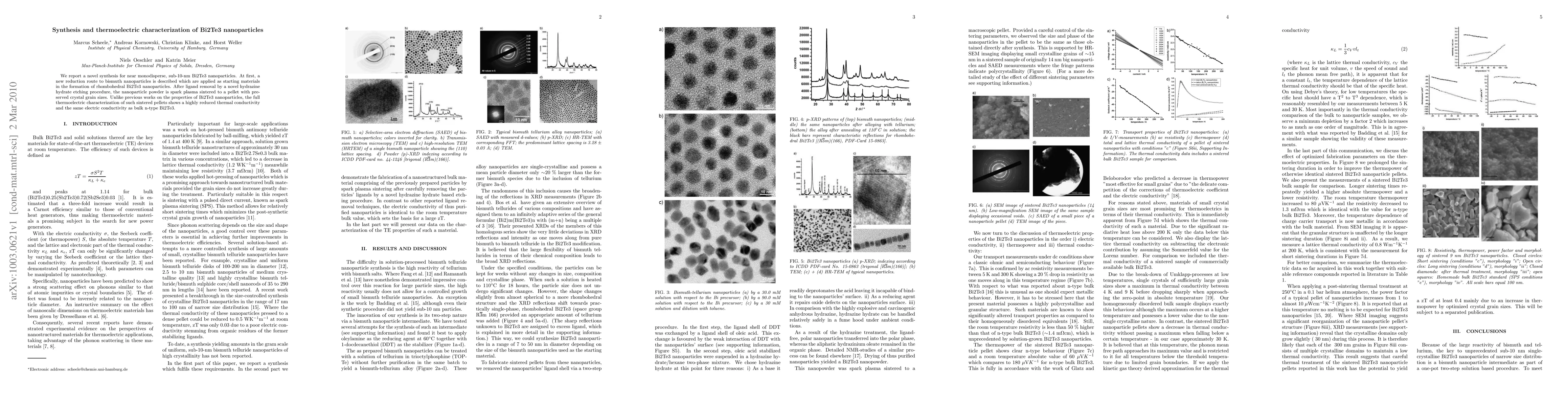 This paper details a new synthesis method for near monodisperse, sub-10-nm Bi2Te3 nanoparticles, achieving reduced thermal conductivity while maintaining the same electric conductivity as bulk n-type Bi2Te3 through spark plasma sintering. The thermoelectric characterization reveals significant improvements in thermoelectric performance.