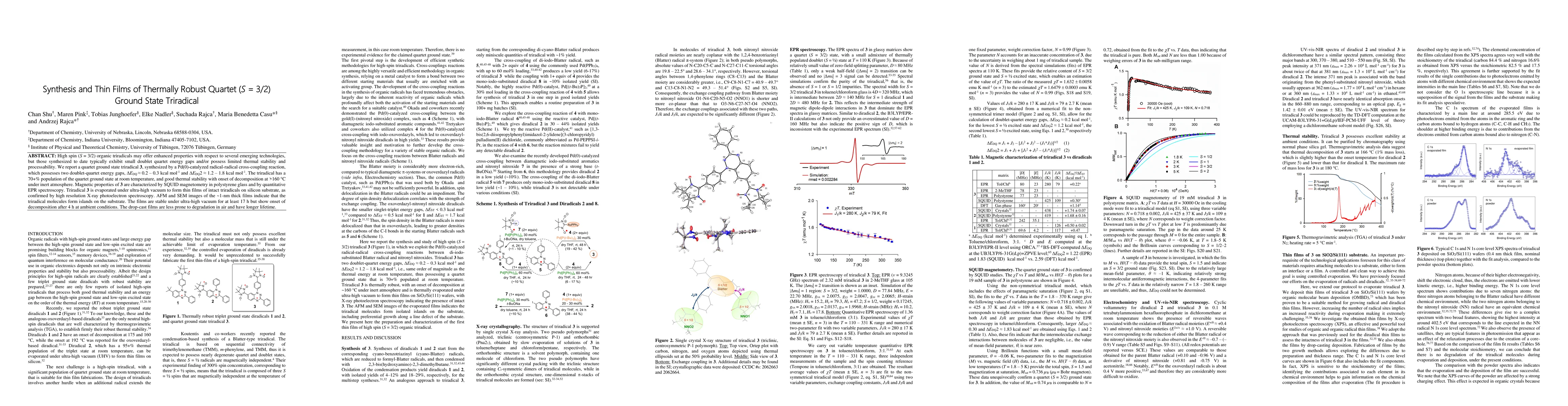 High spin (S=3/2) organic triradicals may offer enhanced properties with respect to several emerging technologies, but those synthesized to date typically exhibit small doublet quartet energy gaps and/or possess limited thermal stability and processability. We report a quartet ground state triradical 3, synthesized by a Pd(0)-catalyzed radical-radical cross-coupling reaction, which possesses two doublet-quartet energy gaps, DeltaEDQ ~ 0.2-0.3 kcal mol-1 and DealtaEDQ2 ~ 1.2-1.8 kcal mol-1. The triradical has a 70+% population of the quartet ground state at room temperature, and good thermal stability with onset of decomposition at > 160 {\deg}C under inert atmosphere. Magnetic properties of 3 are characterized by SQUID magnetometry in polystyrene glass and by quantitative EPR spectroscopy. Triradical 3 is evaporated under ultra-high vacuum to form thin films of intact triradicals on silicon substrate, as confirmed by high resolution X-ray photoelectron spectroscopy. AFM and SEM images of the around 1 nm thick films indicate that the triradical molecules form islands on the substrate. The films are stable under ultra-high vacuum for at least 17 h but show onset of decomposition after 4 h at ambient conditions. The drop-cast films are less prone to degradation in air and have longer lifetime.