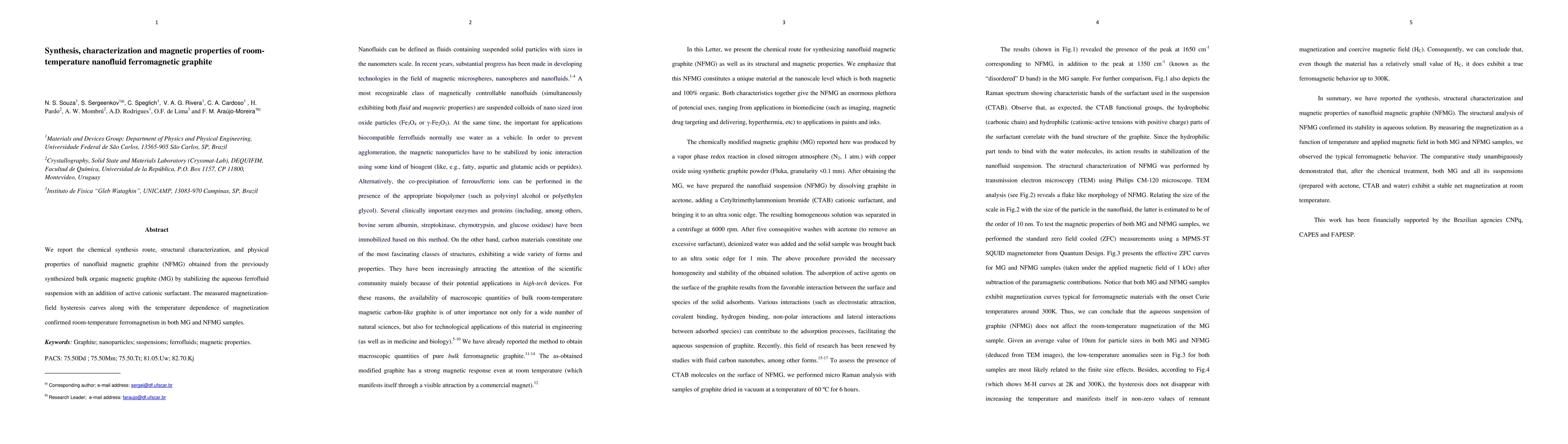 We report the chemical synthesis route, structural characterization, and physical properties of nanofluid magnetic graphite (NFMG) obtained from the previously synthesized bulk organic magnetic graphite (MG) by stabilizing the aqueous ferrofluid suspension with an addition of active cationic surfactant. The measured magnetization-field hysteresis curves along with the temperature dependence of magnetization confirmed room-temperature ferromagnetism in both MG and NFMG samples.