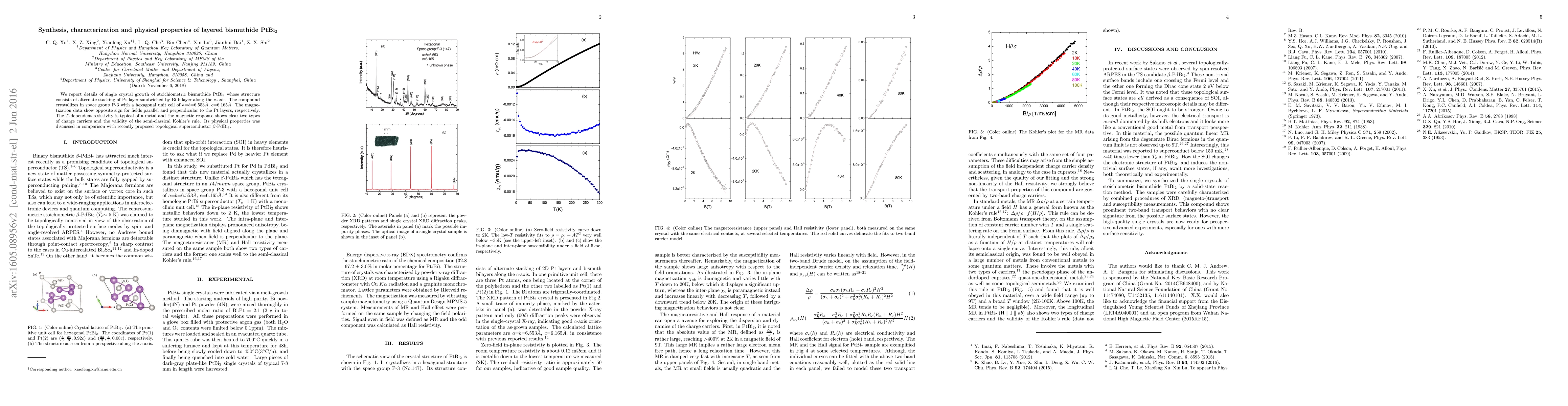 We report details of single crystal growth of stoichiometric bismuthide PtBi$_2$ whose structure consists of alternate stacking of Pt layer sandwiched by Bi bilayer along the $c$-axis. The compound crystallizes in space group P-3 with a hexagonal unit cell of $a$=$b$=6.553$\AA$, $c$=6.165$\AA$. The magnetization data show opposite sign for fields parallel and perpendicular to the Pt layers, respectively. The $T$-dependent resistivity is typical of a metal and the magnetic response shows clear two types of charge carriers and the validity of the semi-classical Kohler's rule. Its physical properties was discussed in comparison with recently proposed topological superconductor $\beta$-PdBi$_2$.