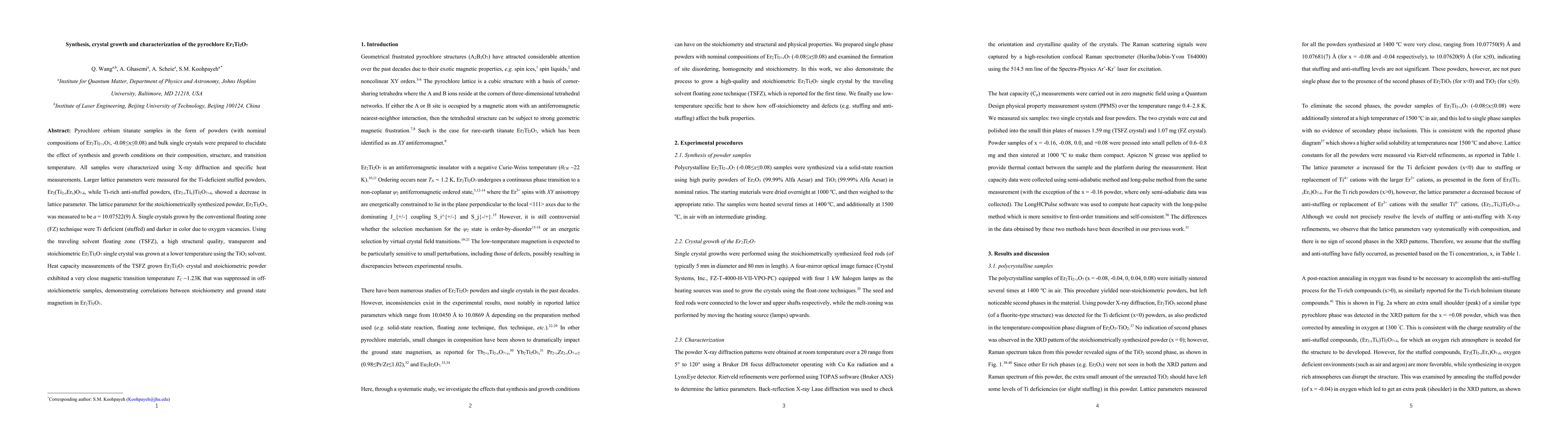 This paper investigates the synthesis and crystal growth of pyrochlore erbium titanate (Er2Ti2O7) to understand the impact of synthesis conditions on its composition, structure, and magnetic transition temperature. The study reveals that Ti-deficient powders have larger lattice parameters, while Ti-rich powders show a decrease in lattice parameter, with stoichiometric Er2Ti2O7 having a lattice parameter of 10.07522(9) Å. Single crystals grown by different techniques exhibit varying stoichiometry and structural quality, with stoichiometric crystals showing a magnetic transition temperature of ~1.23K, indicating a correlation between stoichiometry and magnetism in Er2Ti2O7.