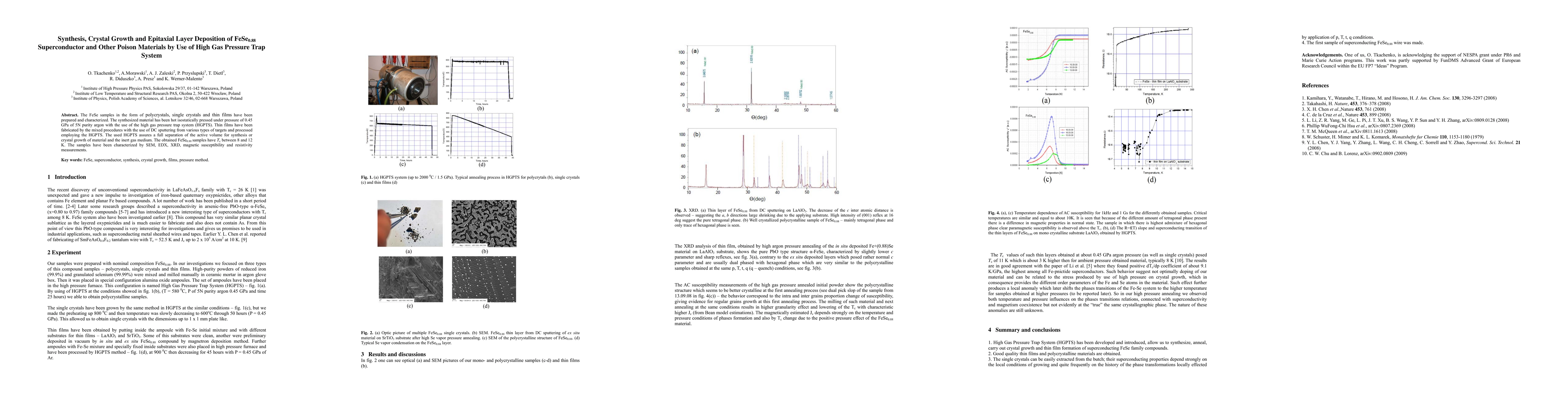 The FeSe samples in the form of polycrystals, single crystals and thin films have been prepared and characterized. The synthesized material has been hot isostatically pressed under pressure of 0.45 GPa of 5N purity argon with the use of the high gas pressure trap system (HGPTS). Thin films have been fabricated by the mixed procedures with the use of DC sputtering from various types of targets and processed employing the HGPTS. The used HGPTS assures a full separation of the active volume for synthesis or crystal growth of material and the inert gas medium. The obtained FeSe0.88 samples have Tc between 8 and 12 K. The samples have been characterized by SEM, EDX, XRD, magnetic susceptibility and resistivity measurements.