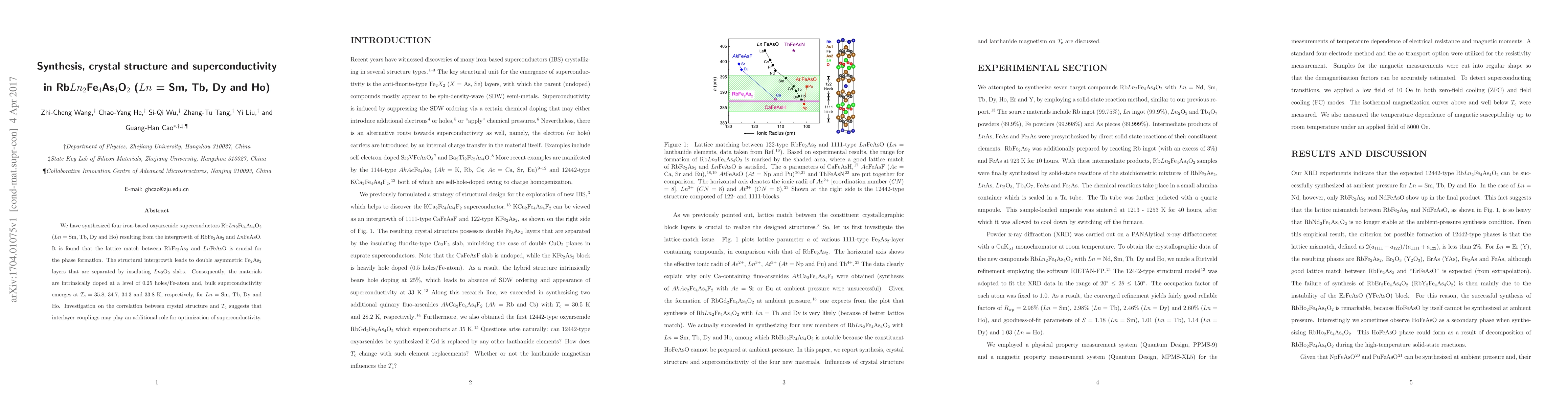 This research synthesizes four iron-based oxyarsenide superconductors with Rb$Ln_2$Fe$_4$As$_4$O$_2$ ($Ln$ = Sm, Tb, Dy, Ho) structures, revealing that lattice matching is vital for phase formation. The materials exhibit superconductivity at temperatures ranging from 33.8 to 35.8 K, suggesting interlayer couplings enhance superconductivity.