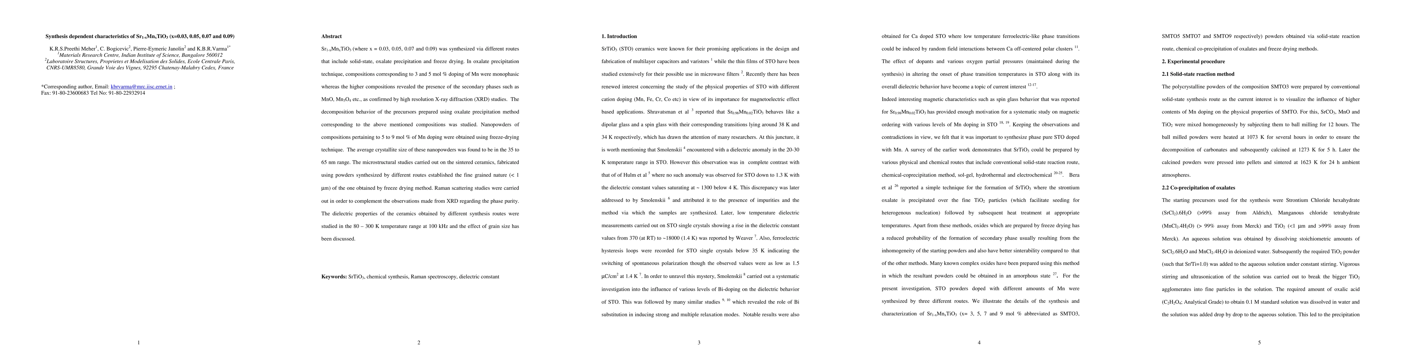 Sr1-xMnxTiO3 (where x = 0.03, 0.05, 0.07 and 0.09) was synthesized via different routes that include solid-state, oxalate precipitation and freeze drying. In oxalate precipitation technique, compositions corresponding to 3 and 5 mol % doping of Mn were monophasic whereas the higher compositions revealed the presence of the secondary phases such as MnO, Mn3O4 etc., as confirmed by high resolution X-ray diffraction (XRD) studies. The decomposition behavior of the precursors prepared using oxalate precipitation method corresponding to the above mentioned compositions was studied. Nanopowders of compositions pertaining to 5 to 9 mol % of Mn doping were obtained using freeze-drying technique. The average crystallite size of these nanopowders was found to be in the 35 to 65 nm range. The microstructural studies carried out on the sintered ceramics, fabricated using powders synthesized by different routes established the fine grained nature (< 1 microm) of the one obtained by freeze drying method. Raman scattering studies were carried out in order to complement the observations made from XRD regarding the phase purity. The dielectric properties of the ceramics obtained by different synthesis routes were studied in the 80 - 300 K temperature range at 100 kHz and the effect of grain size has been discussed.