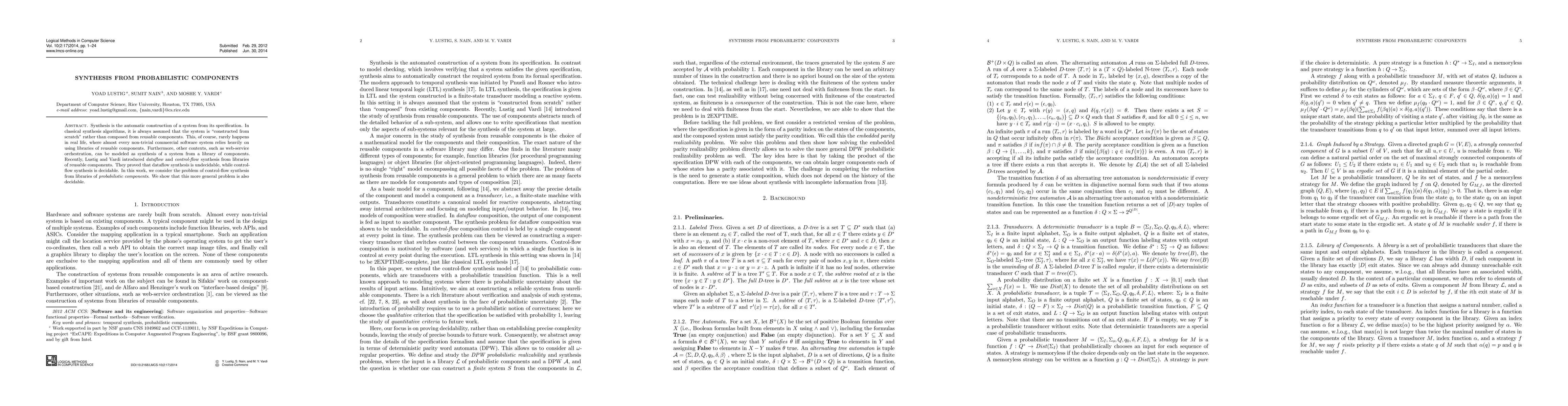 Synthesis is the automatic construction of a system from its specification. In classical synthesis algorithms, it is always assumed that the system is "constructed from scratch" rather than composed from reusable components. This, of course, rarely happens in real life, where almost every non-trivial commercial software system relies heavily on using libraries of reusable components. Furthermore, other contexts, such as web-service orchestration, can be modeled as synthesis of a system from a library of components. Recently, Lustig and Vardi introduced dataflow and control-flow synthesis from libraries of reusable components. They proved that dataflow synthesis is undecidable, while control-flow synthesis is decidable. In this work, we consider the problem of control-flow synthesis from libraries of probabilistic components . We show that this more general problem is also decidable.