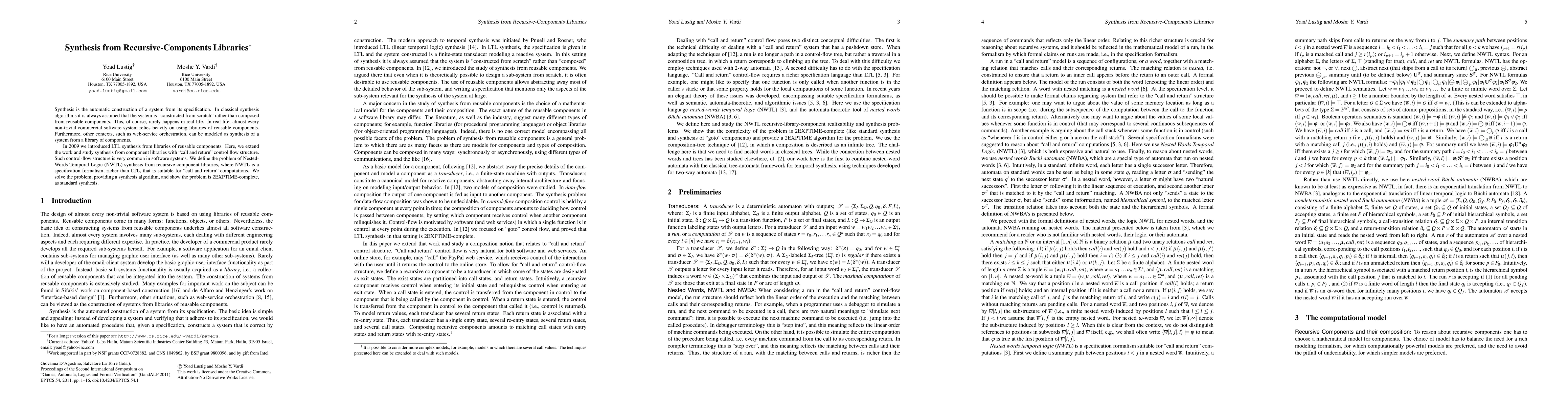 This paper extends previous work on synthesis from reusable component libraries, focusing on the "call and return" control flow structure common in software systems. It introduces a synthesis algorithm for Nested-Words Temporal Logic (NWTL) specifications from recursive component libraries, proving the problem to be 2EXPTIME-complete.