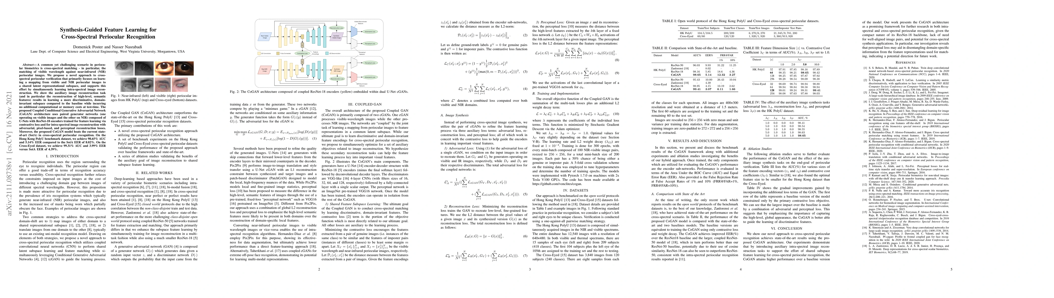 A common yet challenging scenario in periocular biometrics is cross-spectral matching - in particular, the matching of visible wavelength against near-infrared (NIR) periocular images. We propose a novel approach to cross-spectral periocular verification that primarily focuses on learning a mapping from visible and NIR periocular images to a shared latent representational subspace, and supports this effort by simultaneously learning intra-spectral image reconstruction. We show the auxiliary image reconstruction task (and in particular the reconstruction of high-level, semantic features) results in learning a more discriminative, domain-invariant subspace compared to the baseline while incurring no additional computational or memory costs at test-time. The proposed Coupled Conditional Generative Adversarial Network (CoGAN) architecture uses paired generator networks (one operating on visible images and the other on NIR) composed of U-Nets with ResNet-18 encoders trained for feature learning via contrastive loss and for intra-spectral image reconstruction with adversarial, pixel-based, and perceptual reconstruction losses. Moreover, the proposed CoGAN model beats the current state-of-art (SotA) in cross-spectral periocular recognition. On the Hong Kong PolyU benchmark dataset, we achieve 98.65% AUC and 5.14% EER compared to the SotA EER of 8.02%. On the Cross-Eyed dataset, we achieve 99.31% AUC and 3.99% EER versus SotA EER of 4.39%.