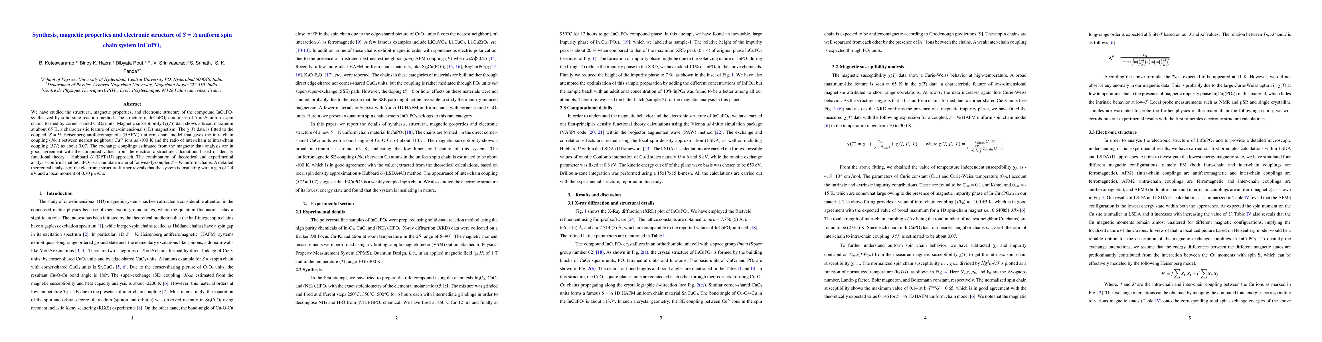 InCuPO5 exhibits S = 1/2 uniform spin chains formed by corner-shared CuO4 units, displaying one-dimensional magnetism with a broad magnetic susceptibility peak at 65 K. Theoretical and experimental analyses confirm the material's suitability as a weakly coupled S = 1/2 system, with an insulating electronic structure featuring a 2.4 eV gap.