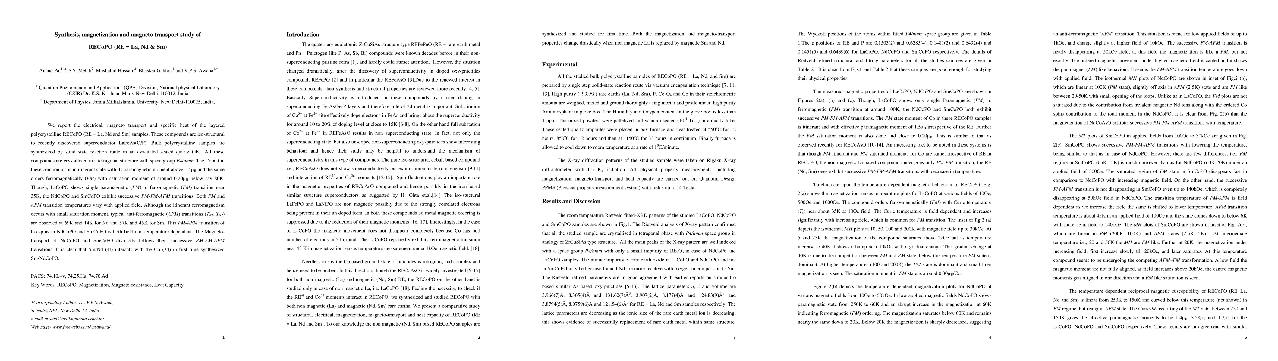 This study investigates the synthesis, magnetization, and magneto transport properties of RECoPO (RE = La, Nd, Sm) compounds, which are structurally similar to the superconductor LaFeAs(O/F). The compounds exhibit ferromagnetic ordering in LaCoPO and successive paramagnetic-ferromagnetic-antiferromagnetic transitions in NdCoPO and SmCoPO, influenced by both temperature and applied magnetic field. The magneto-transport behavior correlates with these magnetic transitions, highlighting interactions between the 4f electrons of Sm/Nd and the 3d electrons of Co.