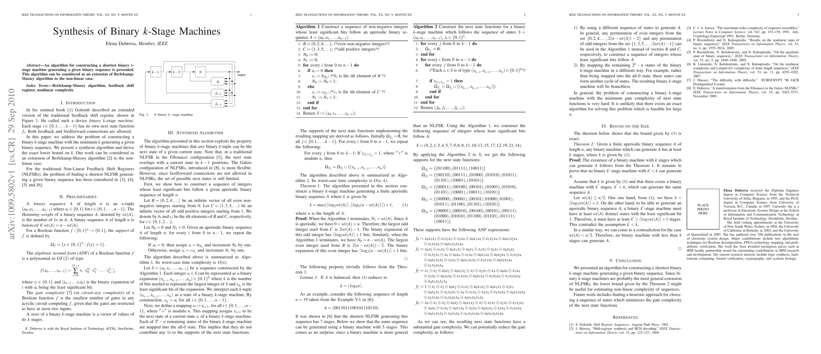 An algorithm for constructing a shortest binary k-stage machine generating a given binary sequence is presented. This algorithm can be considered as an extension of Berlekamp-Massey algorithm to the non-linear case.