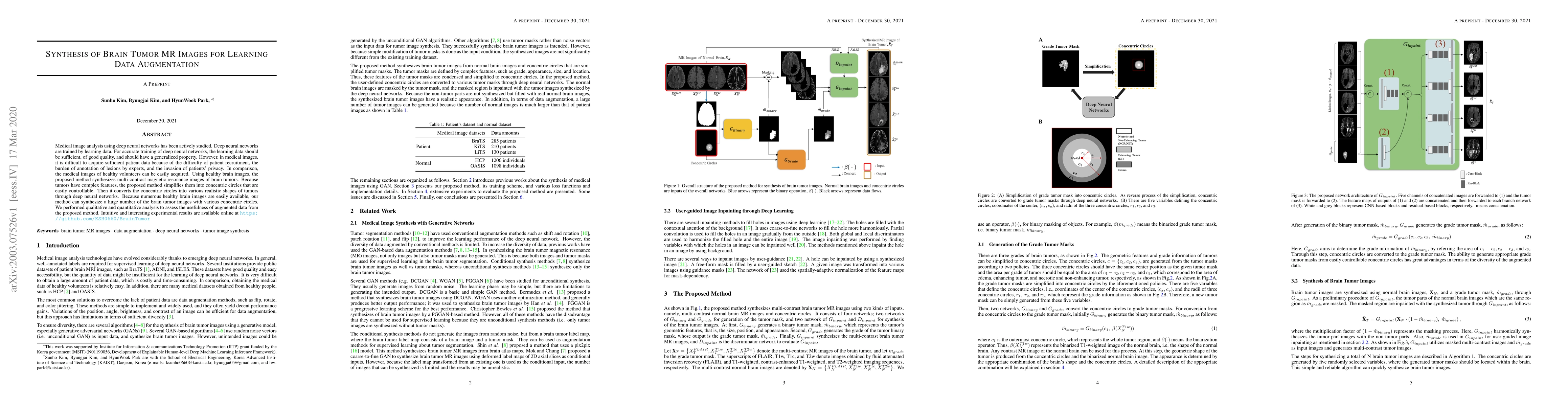 Medical image analysis using deep neural networks has been actively studied. Deep neural networks are trained by learning data. For accurate training of deep neural networks, the learning data should be sufficient, of good quality, and should have a generalized property. However, in medical images, it is difficult to acquire sufficient patient data because of the difficulty of patient recruitment, the burden of annotation of lesions by experts, and the invasion of patients' privacy. In comparison, the medical images of healthy volunteers can be easily acquired. Using healthy brain images, the proposed method synthesizes multi-contrast magnetic resonance images of brain tumors. Because tumors have complex features, the proposed method simplifies them into concentric circles that are easily controllable. Then it converts the concentric circles into various realistic shapes of tumors through deep neural networks. Because numerous healthy brain images are easily available, our method can synthesize a huge number of the brain tumor images with various concentric circles. We performed qualitative and quantitative analysis to assess the usefulness of augmented data from the proposed method. Intuitive and interesting experimental results are available online at https://github.com/KSH0660/BrainTumor
