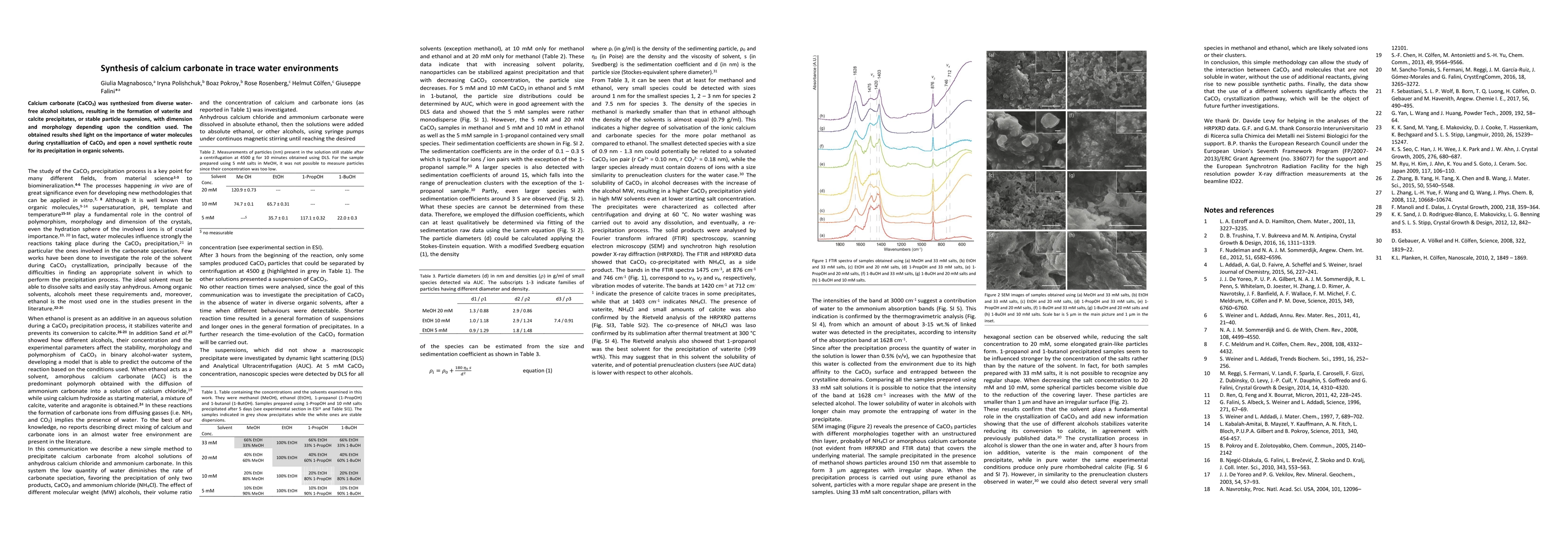 Calcium carbonate (CaCO3) was synthesized from diverse water-free alcohol solutions, resulting in the formation of vaterite and calcite precipitates, or stable particle supensions, with dimension and morphology depending upon the condition used. The obtained results shed light on the importance of water molecules during crystallization of CaCO3 and open a novel synthetic route for its precipitation in organic solvents.