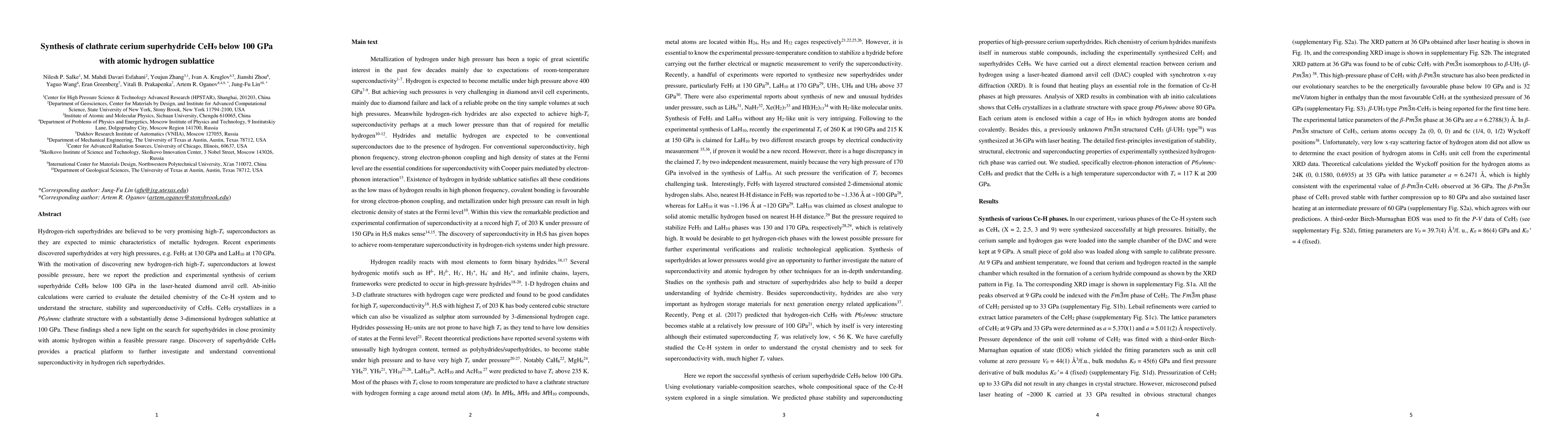 Researchers have synthesized cerium superhydride CeH9 below 100 GPa, featuring a dense 3-dimensional hydrogen sublattice in a clathrate structure. The discovery provides a promising platform for studying high-temperature superconductivity in hydrogen-rich materials at feasible pressures.