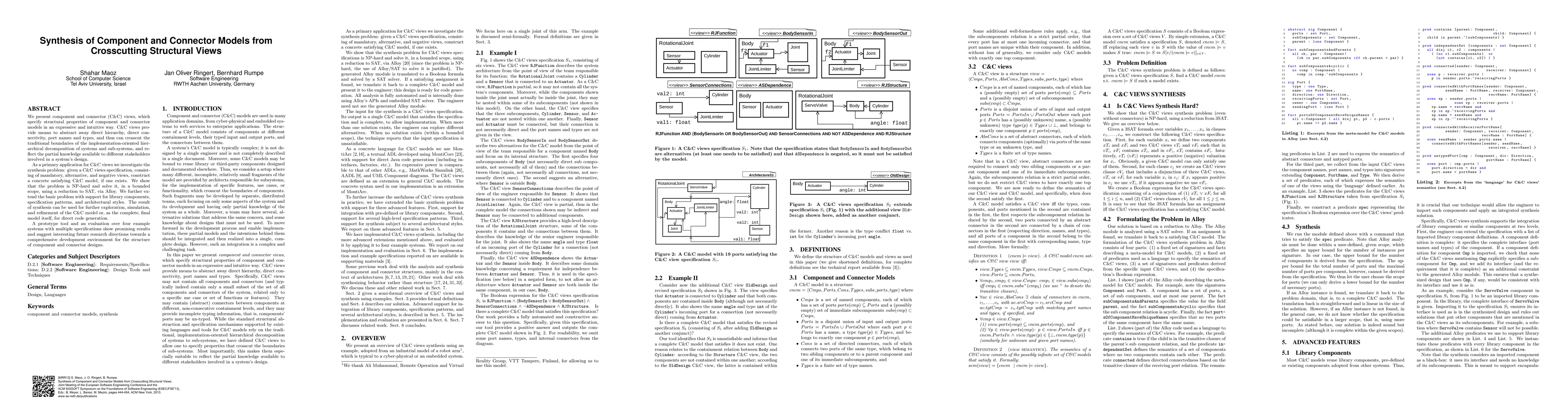 This paper presents a method for synthesizing component and connector (C&C) models from crosscutting structural views, demonstrating the NP-hardness of the synthesis problem and providing a solution using Alloy. The approach supports library components, specification patterns, and architectural styles, and a prototype tool shows promising results for future development environments.