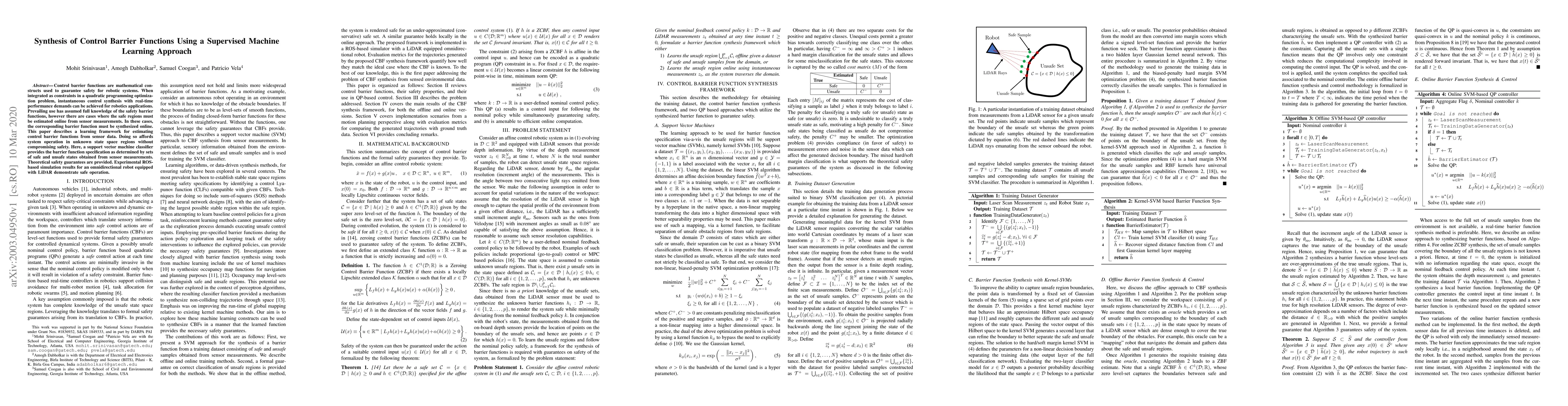 This paper presents a supervised machine learning approach to synthesize control barrier functions from sensor data, enabling safe operation in unknown state spaces. A support vector machine classifier is used to estimate the barrier function based on safe and unsafe state sets derived from sensor measurements, with theoretical safety guarantees and demonstrated through ROS-based simulation of an omnidirectional robot.