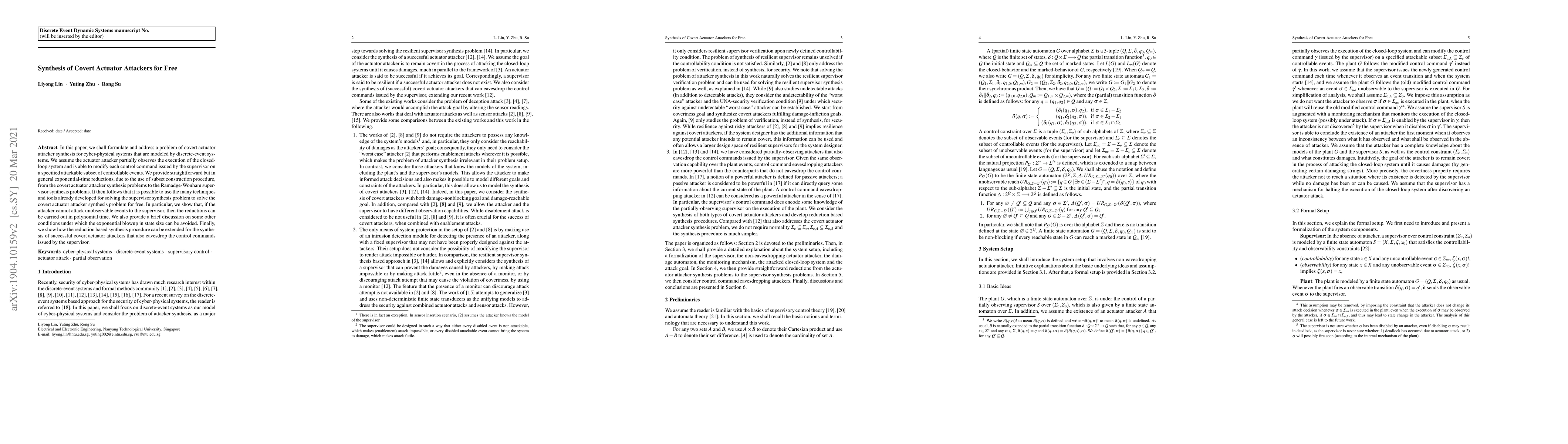This paper formulates and solves the covert actuator attacker synthesis problem for discrete-event cyber-physical systems, providing exponential-time reductions to the supervisor synthesis problem. It demonstrates that under certain conditions, these reductions can be polynomial, and discusses extensions for attackers that also eavesdrop on control commands.