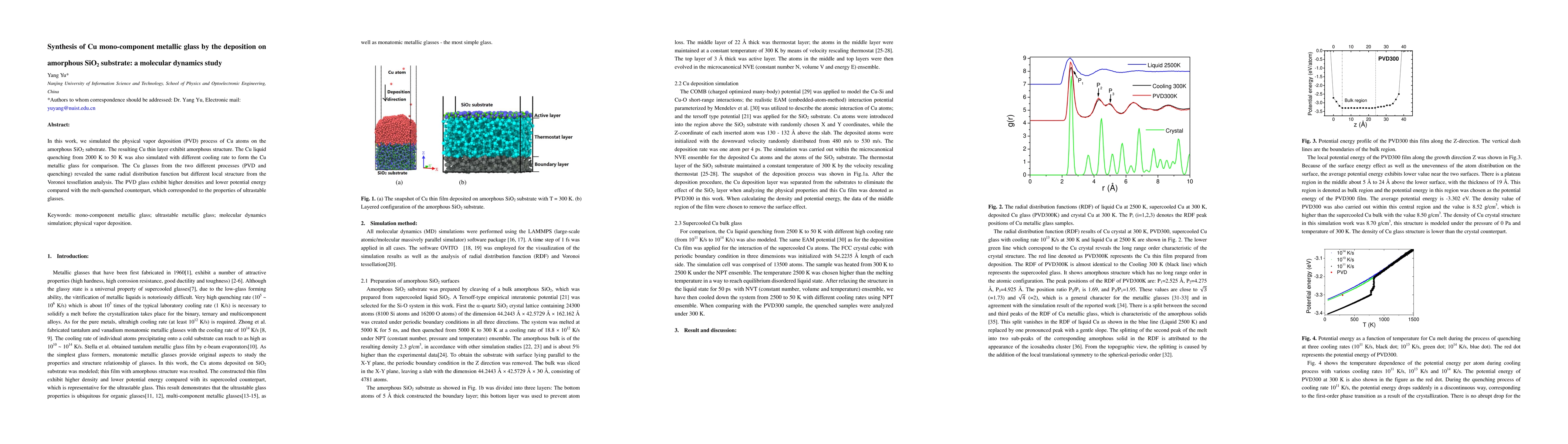 This study uses molecular dynamics to simulate Cu mono-component metallic glass formation via physical vapor deposition on an amorphous SiO$_2$ substrate and compares it with Cu metallic glass formed by liquid quenching. Both processes yield Cu glasses with similar radial distribution functions but different local structures, with PVD-formed glasses showing higher density and lower potential energy.