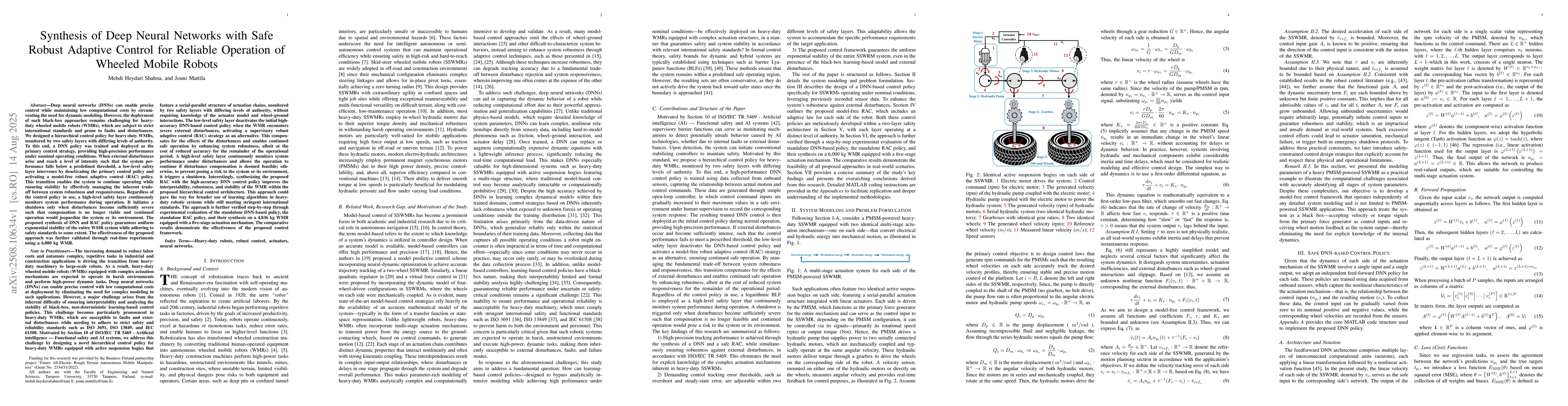 Deep neural networks (DNNs) can enable precise control while maintaining low computational costs by circumventing the need for dynamic modeling. However, the deployment of such black-box approaches remains challenging for heavy-duty wheeled mobile robots (WMRs), which are subject to strict international standards and prone to faults and disturbances. We designed a hierarchical control policy for heavy-duty WMRs, monitored by two safety layers with differing levels of authority. To this end, a DNN policy was trained and deployed as the primary control strategy, providing high-precision performance under nominal operating conditions. When external disturbances arise and reach a level of intensity such that the system performance falls below a predefined threshold, a low-level safety layer intervenes by deactivating the primary control policy and activating a model-free robust adaptive control (RAC) policy. This transition enables the system to continue operating while ensuring stability by effectively managing the inherent trade-off between system robustness and responsiveness. Regardless of the control policy in use, a high-level safety layer continuously monitors system performance during operation. It initiates a shutdown only when disturbances become sufficiently severe such that compensation is no longer viable and continued operation would jeopardize the system or its environment. The proposed synthesis of DNN and RAC policy guarantees uniform exponential stability of the entire WMR system while adhering to safety standards to some extent. The effectiveness of the proposed approach was further validated through real-time experiments using a 6,000 kg WMR.