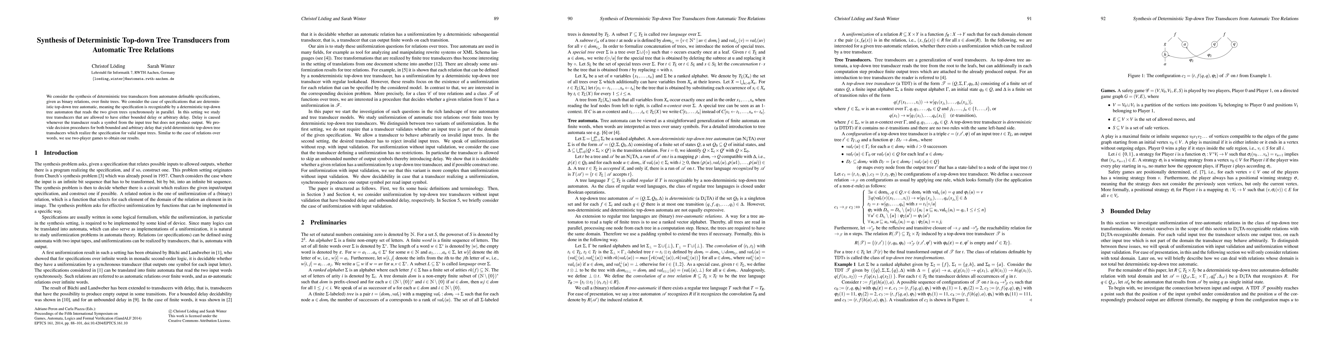 This paper presents decision procedures for synthesizing deterministic top-down tree transducers from deterministic top-down tree automatic relations, addressing both bounded and arbitrary delay scenarios, and uses two-player games for the synthesis process.