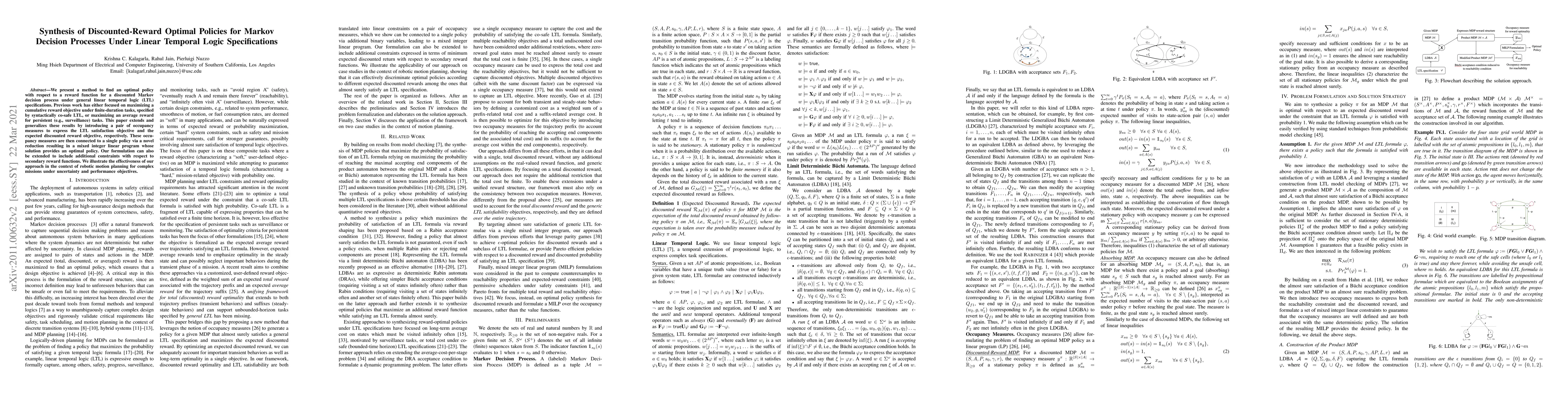 This paper develops a method for synthesizing optimal discounted-reward policies for Markov decision processes under linear temporal logic specifications, using occupancy measures to connect LTL satisfaction and reward objectives. The approach results in a mixed integer linear program that finds optimal policies, demonstrated through robotic motion planning applications.