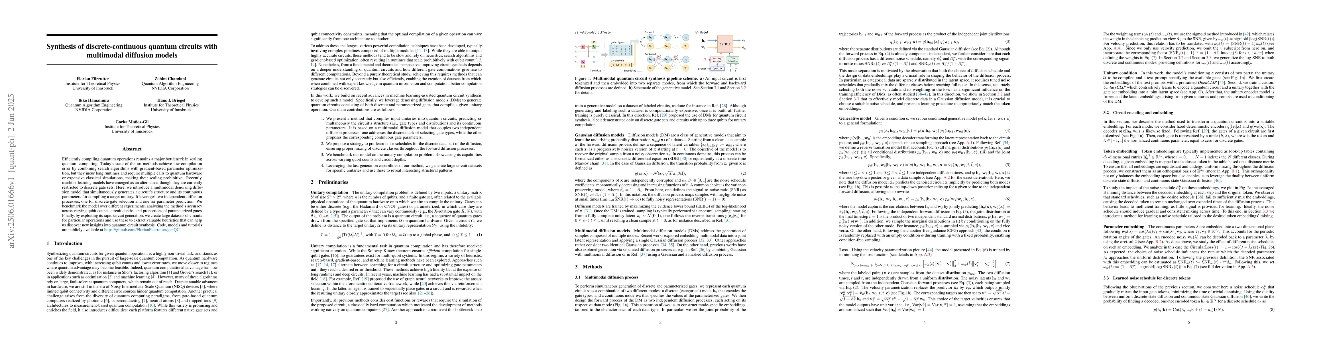 The introduction of a multimodal diffusion model capable of simultaneously generating quantum circuit structure and continuous parameters for compiling target unitaries.