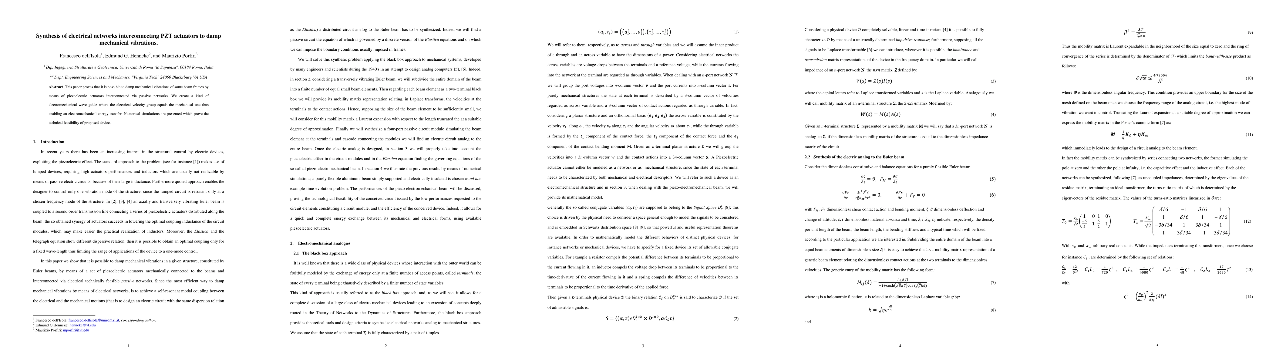 This paper demonstrates the effective damping of mechanical vibrations in beam frames using passive electrical networks interconnecting piezoelectric actuators, achieving an electromechanical energy transfer where electrical and mechanical velocities are matched. Numerical simulations validate the proposed device's technical feasibility.