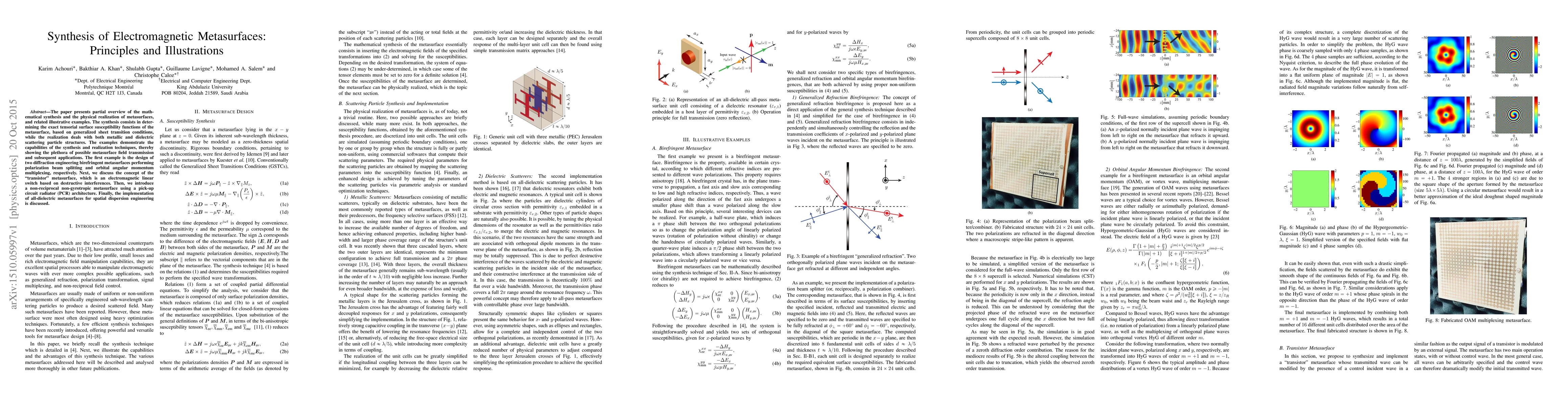 This paper outlines the mathematical synthesis and physical realization of electromagnetic metasurfaces, focusing on tensorial surface susceptibility functions and various scattering particle structures. It illustrates the techniques through examples including birefringent metasurfaces for polarization beam splitting, a "transistor" metasurface for electromagnetic switching, and non-reciprocal metasurfaces, concluding with all-dielectric metasurfaces for spatial dispersion.