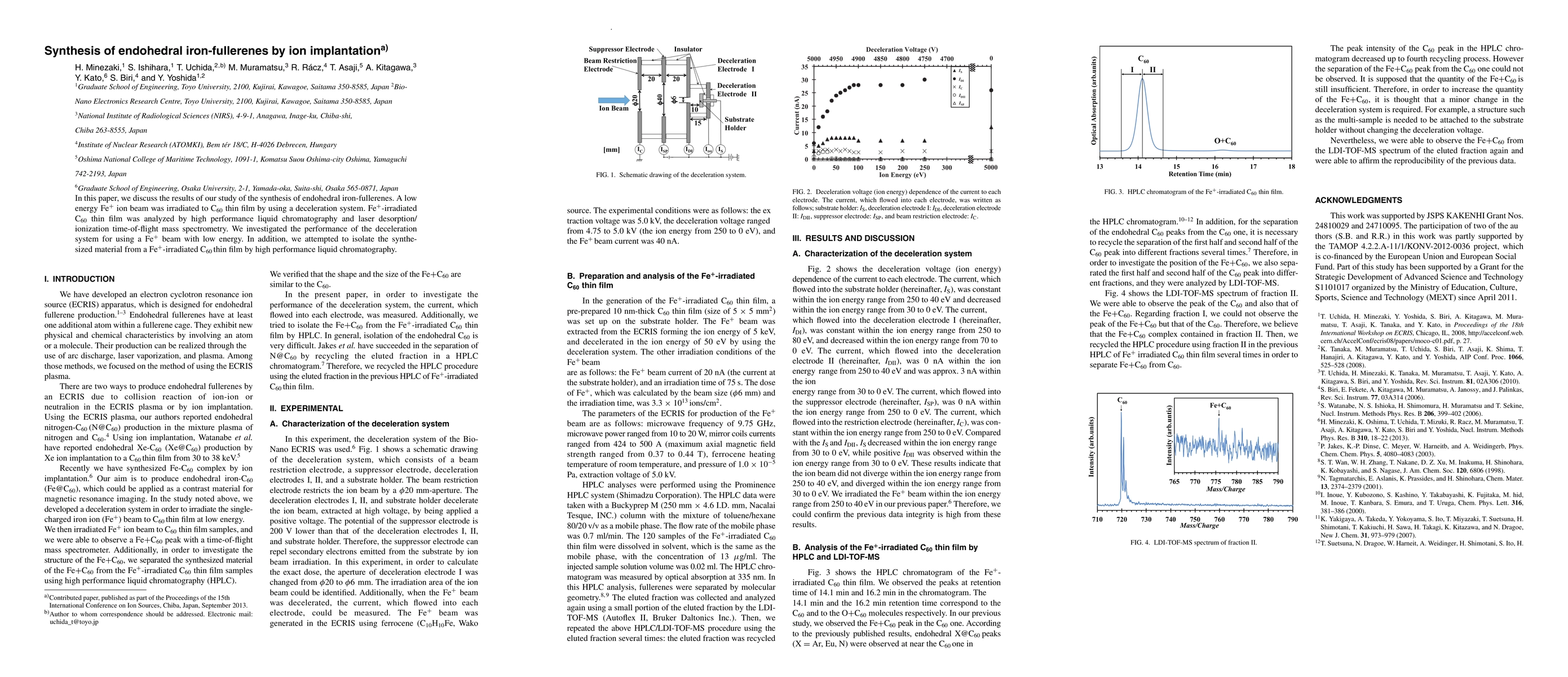 This study synthesizes endohedral iron-fullerenes using low energy Fe+ ion implantation into C60 thin films. The effectiveness of the deceleration system for the Fe+ beam is evaluated, and high performance liquid chromatography is employed to isolate the synthesized material.