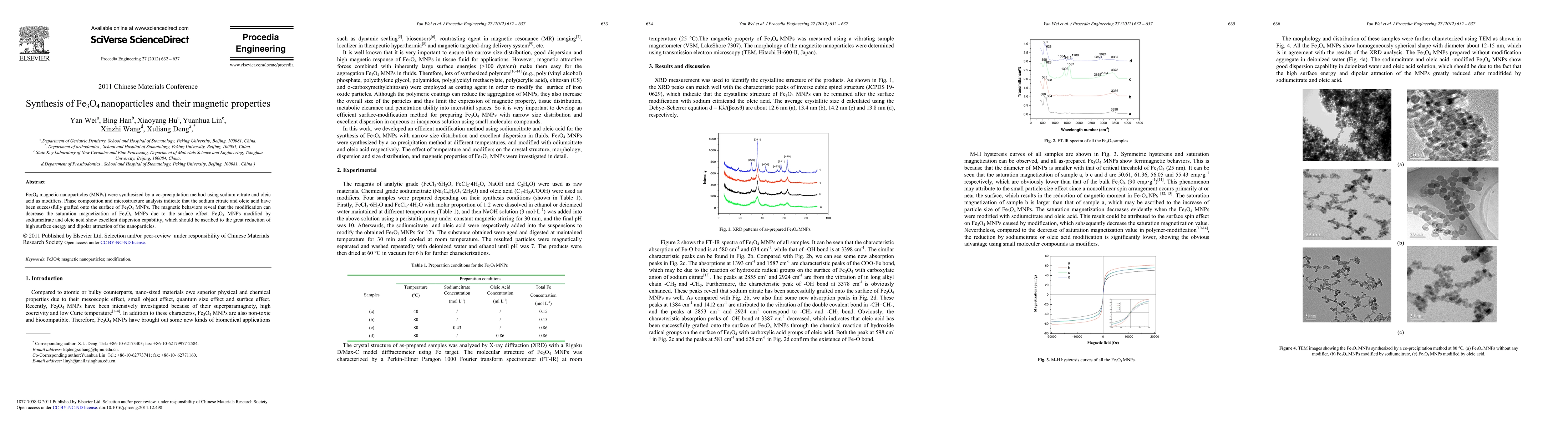 Fe$_3$O$_4$ magnetic nanoparticles were synthesized via co-precipitation with sodium citrate and oleic acid as modifiers, showing successful surface grafting and reduced saturation magnetization. The modified nanoparticles exhibit excellent dispersion due to decreased surface energy and dipolar attraction.
