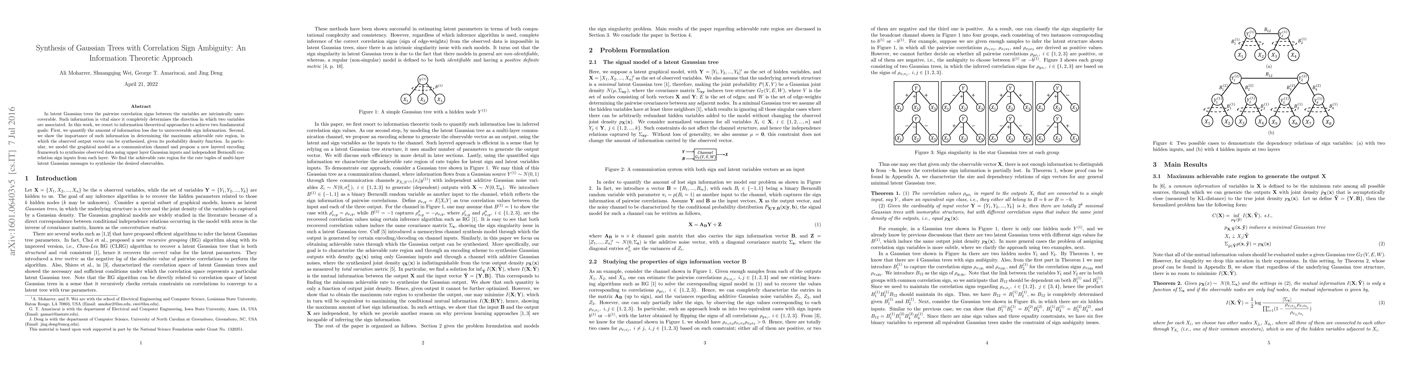 In latent Gaussian trees the pairwise correlation signs between the variables are intrinsically unrecoverable. Such information is vital since it completely determines the direction in which two variables are associated. In this work, we resort to information theoretical approaches to achieve two fundamental goals: First, we quantify the amount of information loss due to unrecoverable sign information. Second, we show the importance of such information in determining the maximum achievable rate region, in which the observed output vector can be synthesized, given its probability density function. In particular, we model the graphical model as a communication channel and propose a new layered encoding framework to synthesize observed data using upper layer Gaussian inputs and independent Bernoulli correlation sign inputs from each layer. We find the achievable rate region for the rate tuples of multi-layer latent Gaussian messages to synthesize the desired observables.