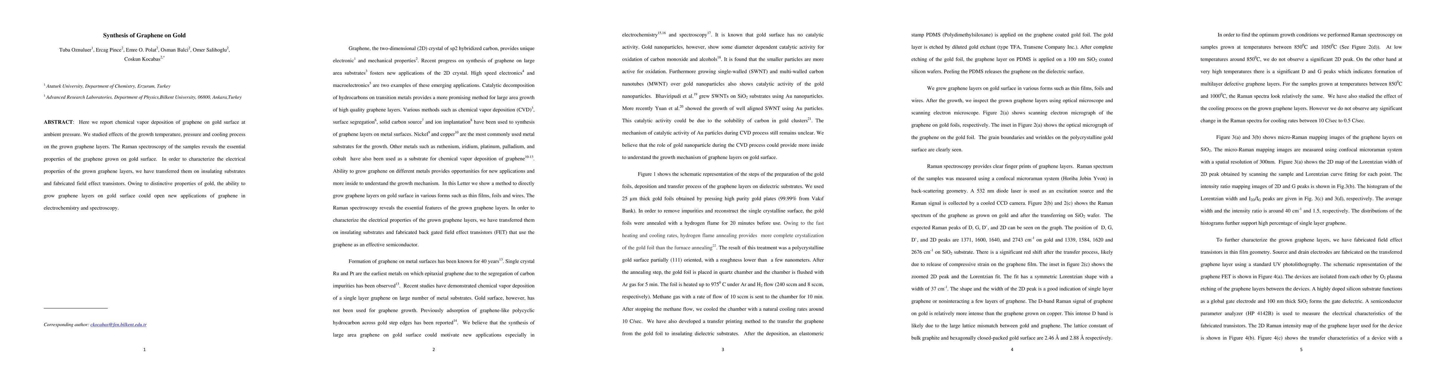 This paper details the chemical vapor deposition of graphene on gold surfaces, exploring the impact of growth conditions on layer properties. The study uses Raman spectroscopy and field effect transistors to characterize the graphene, highlighting potential new applications in electrochemistry and spectroscopy due to gold's unique properties.