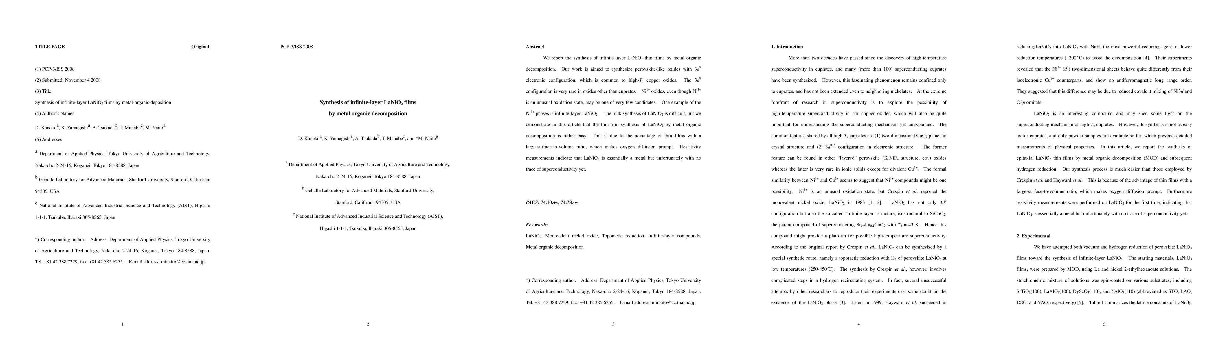 This paper details the successful synthesis of infinite-layer LaNiO2 thin films via metal organic decomposition, highlighting the ease of thin-film fabrication due to enhanced oxygen diffusion. Although resistivity measurements show LaNiO2 to be metallic, no superconductivity was detected.