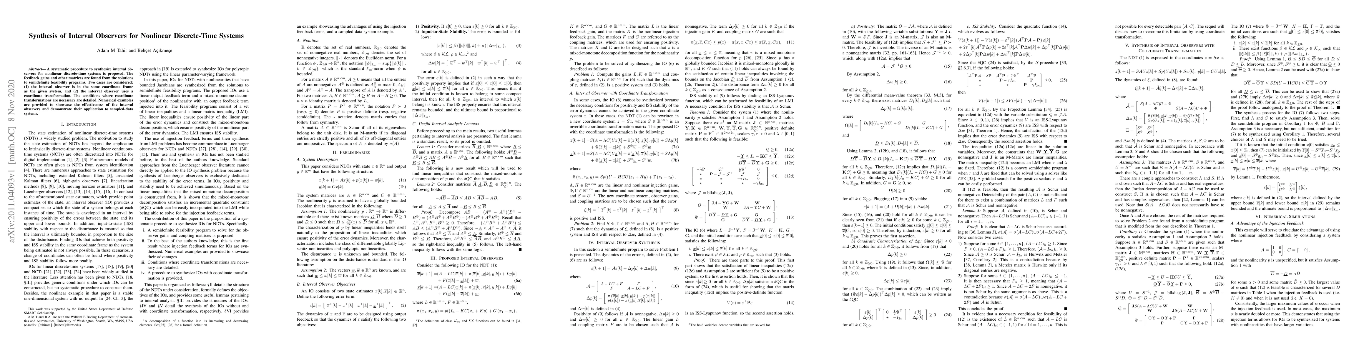 A systematic procedure to synthesize interval observers for nonlinear discrete-time systems is proposed. The feedback gains and other matrices are found from the solutions to semidefinite feasibility programs. Two cases are considered: (1) the interval observer is in the same coordinate frame as the given system, and (2) the interval observer uses a coordinate transformation. The conditions where coordinate transformations are necessary are detailed. Numerical examples are provided to showcase the effectiveness of the interval observers and demonstrate their application to sampled-data systems.