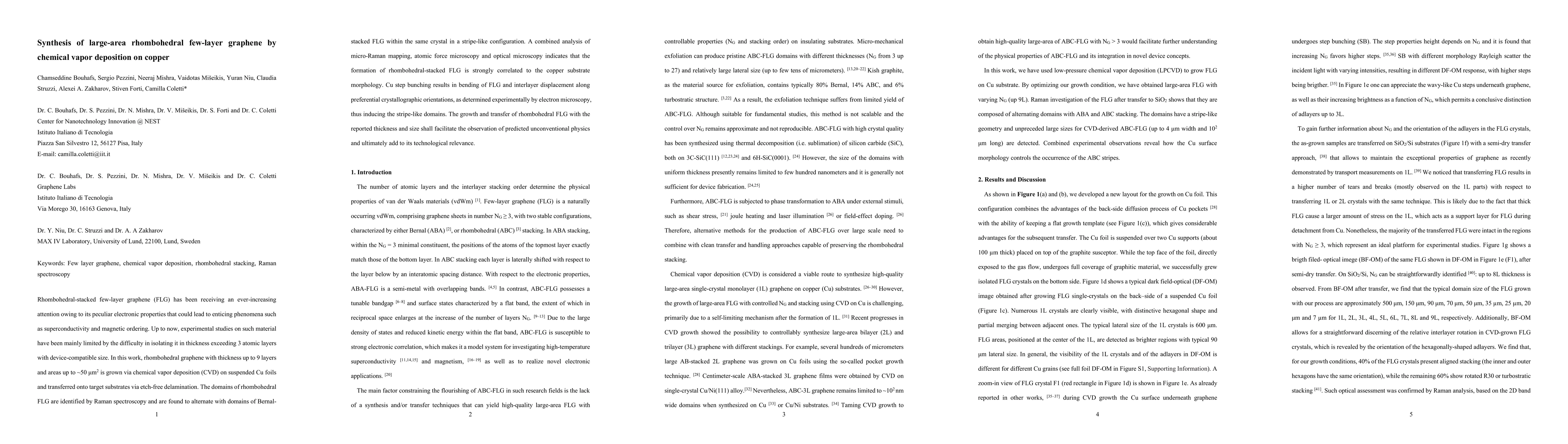 This research presents a method for synthesizing large-area rhombohedral few-layer graphene (FLG) via chemical vapor deposition on suspended copper foils, achieving up to 9 layers and 50 micrometers in size. The growth mechanism is linked to copper substrate morphology, particularly Cu step bunching, which induces rhombohedral stacking in a stripe-like pattern with Bernal-stacked domains.