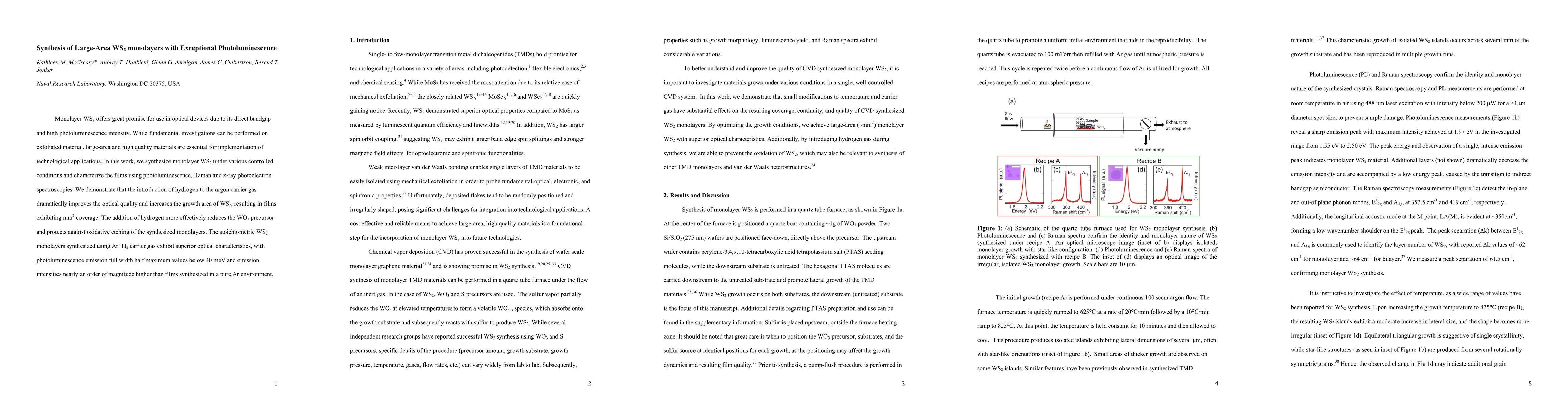 This paper reports the synthesis of large-area WS2 monolayers with enhanced photoluminescence by introducing hydrogen into the argon carrier gas during growth. The hydrogen treatment significantly improves optical quality and increases the growth area, resulting in superior photoluminescence characteristics.