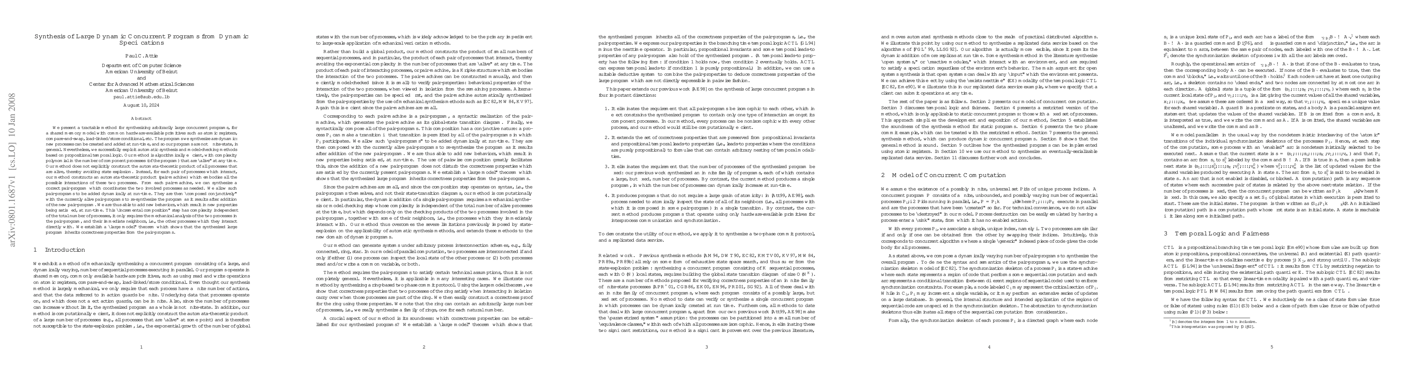 This paper proposes an efficient method for synthesizing large dynamic concurrent programs using automatic synthesis and model-checking techniques based on propositional temporal logic. It avoids state explosion by constructing pair-machines for interacting processes instead of the full automata-theoretic product.