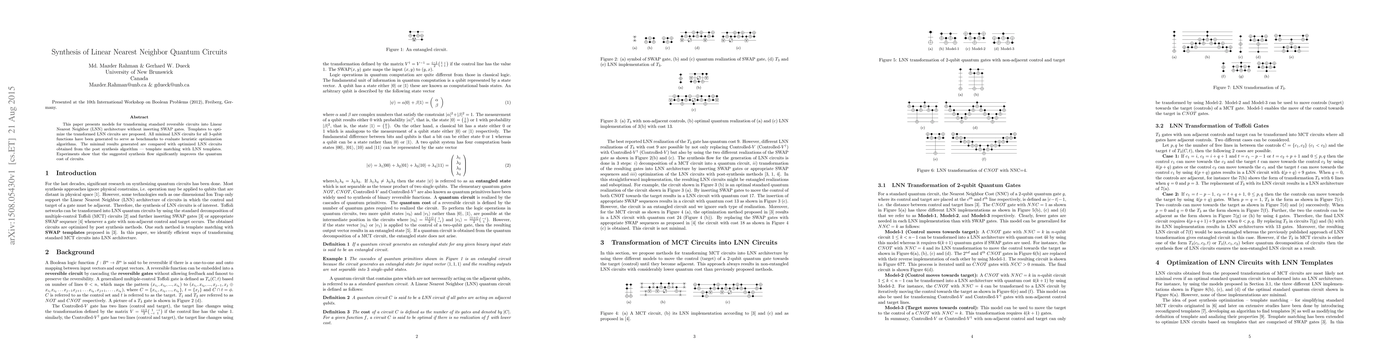 This paper presents models for transforming standard reversible circuits into Linear Nearest Neighbor (LNN) architecture without inserting SWAP gates. Templates to optimize the transformed LNN circuits are proposed. All minimal LNN circuits for all 3-qubit functions have been generated to serve as benchmarks to evaluate heuristic optimization algorithms. The minimal results generated are compared with optimized LNN circuits obtained from the post synthesis algorithm --- template matching with LNN templates. Experiments show that the suggested synthesis flow significantly improves the quantum cost of circuits.