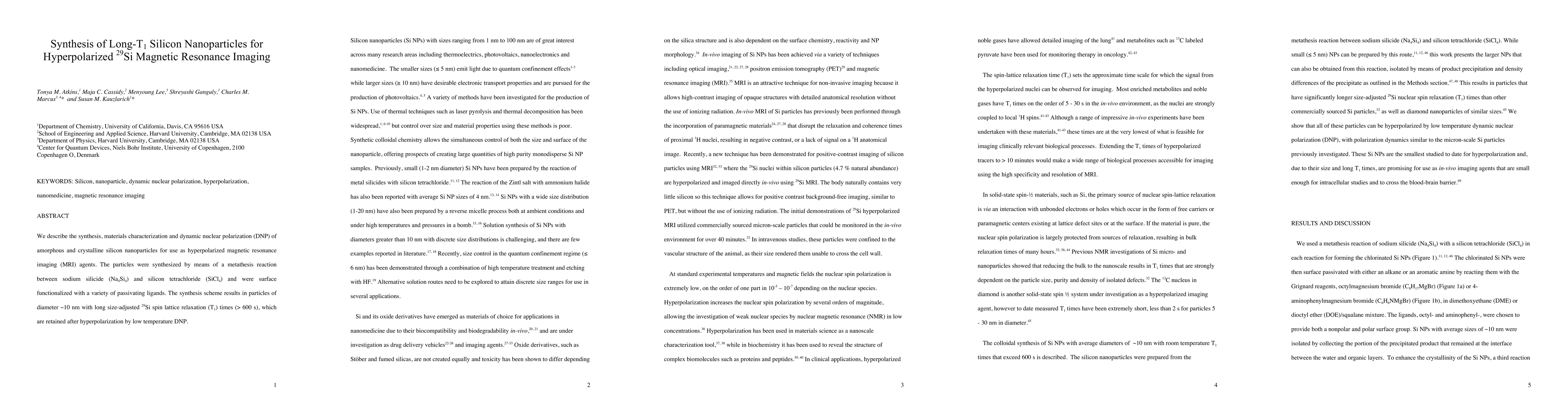 This paper details the synthesis of silicon nanoparticles with long 29Si spin lattice relaxation times for hyperpolarized MRI applications. The nanoparticles, synthesized via a metathesis reaction and functionalized with passivating ligands, exhibit enhanced dynamic nuclear polarization suitable for MRI.