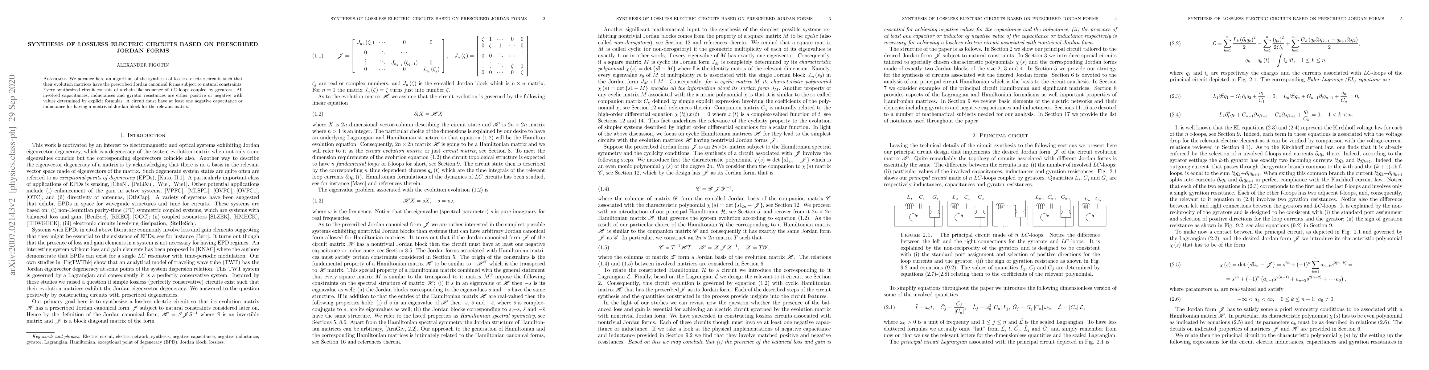 We advance here an algorithm of the synthesis of lossless electric circuits such that their evolution matrices have the prescribed Jordan canonical forms subject to natural constraints. Every synthesized circuit consists of a chain-like sequence of LC-loops coupled by gyrators. All involved capacitances, inductances and gyrator resistances are either positive or negative with values determined by explicit formulas. A circuit must have at least one negative capacitance or inductance for having a nontrivial Jordan block for the relevant matrix.
