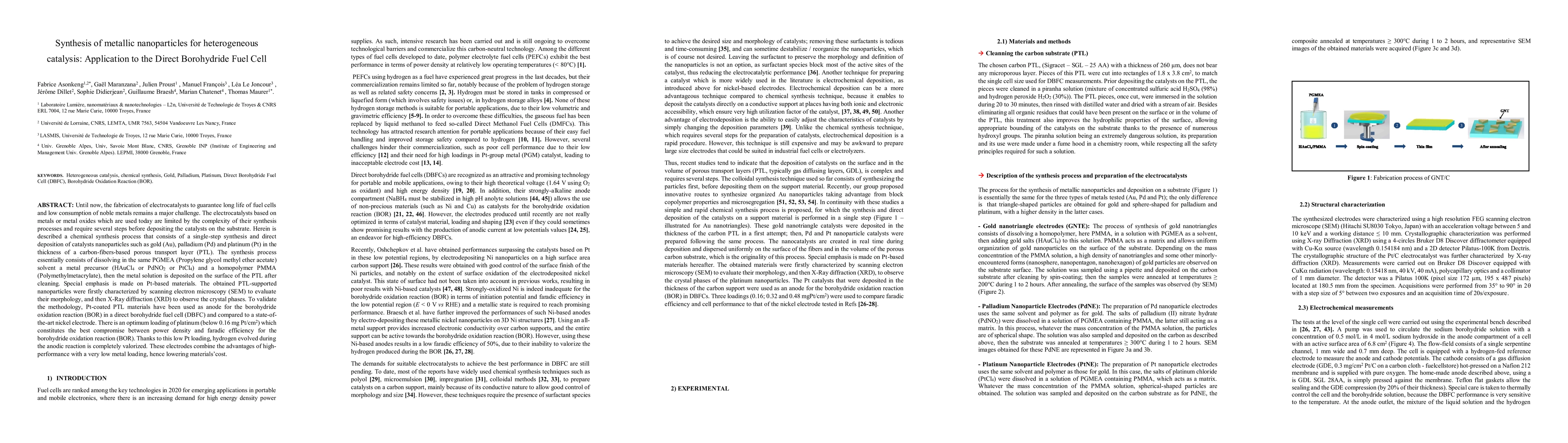 Until now, the fabrication of electrocatalysts to guarantee long life of fuel cells and low consumption of noble metals remains a major challenge. The electrocatalysts based on metals or metal oxides which are used today are limited by the complexity of their synthesis processes and require several steps before depositing the catalysts on the substrate. Herein is described a chemical synthesis process that consists of a single-step synthesis and direct deposition of catalysts nanoparticles such as gold (Au), palladium (Pd) and platinum (Pt) in the thickness of a carbon-fibers-based porous transport layer (PTL). The synthesis process essentially consists of dissolving in the same PGMEA (Propylene glycol methyl ether acetate) solvent a metal precursor (HAuCl4 or PdNO2 or PtCl4) and a homopolymer PMMA (Polymethylmetacrylate), then the metal solution is deposited on the surface of the PTL after cleaning. Special emphasis is made on Pt-based materials. The obtained PTL-supported nanoparticles were firstly characterized by scanning electron microscopy (SEM) to evaluate their morphology, and then X-Ray diffraction (XRD) to observe the crystal phases. To validate the methodology, Pt-coated PTL materials have been used as anode for the borohydride oxidation reaction (BOR) in a direct borohydride fuel cell (DBFC) and compared to a state-of-the-art nickel electrode. There is an optimum loading of platinum (below 0.16 mg Pt/cm2) which constitutes the best compromise between power density and faradic efficiency for the borohydride oxidation reaction (BOR). Thanks to this low Pt loading, hydrogen evolved during the anodic reaction is completely valorized. These electrodes combine the advantages of high-performance with a very low metal loading, hence lowering materials cost.